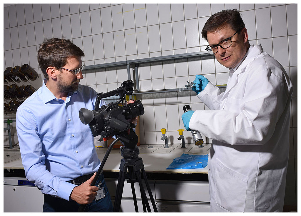 Parfois, les chercheurs endossent des costumes d’acteurs. Cette image a été prise fin septembre dans la salle des comparateurs d’armes à feu, à l’Ecole des sciences criminelles (ESC). Une équipe de scientifiques participe au tournage d’un cours en ligne gratuit et ouvert à tous, produit par l’UNIL.