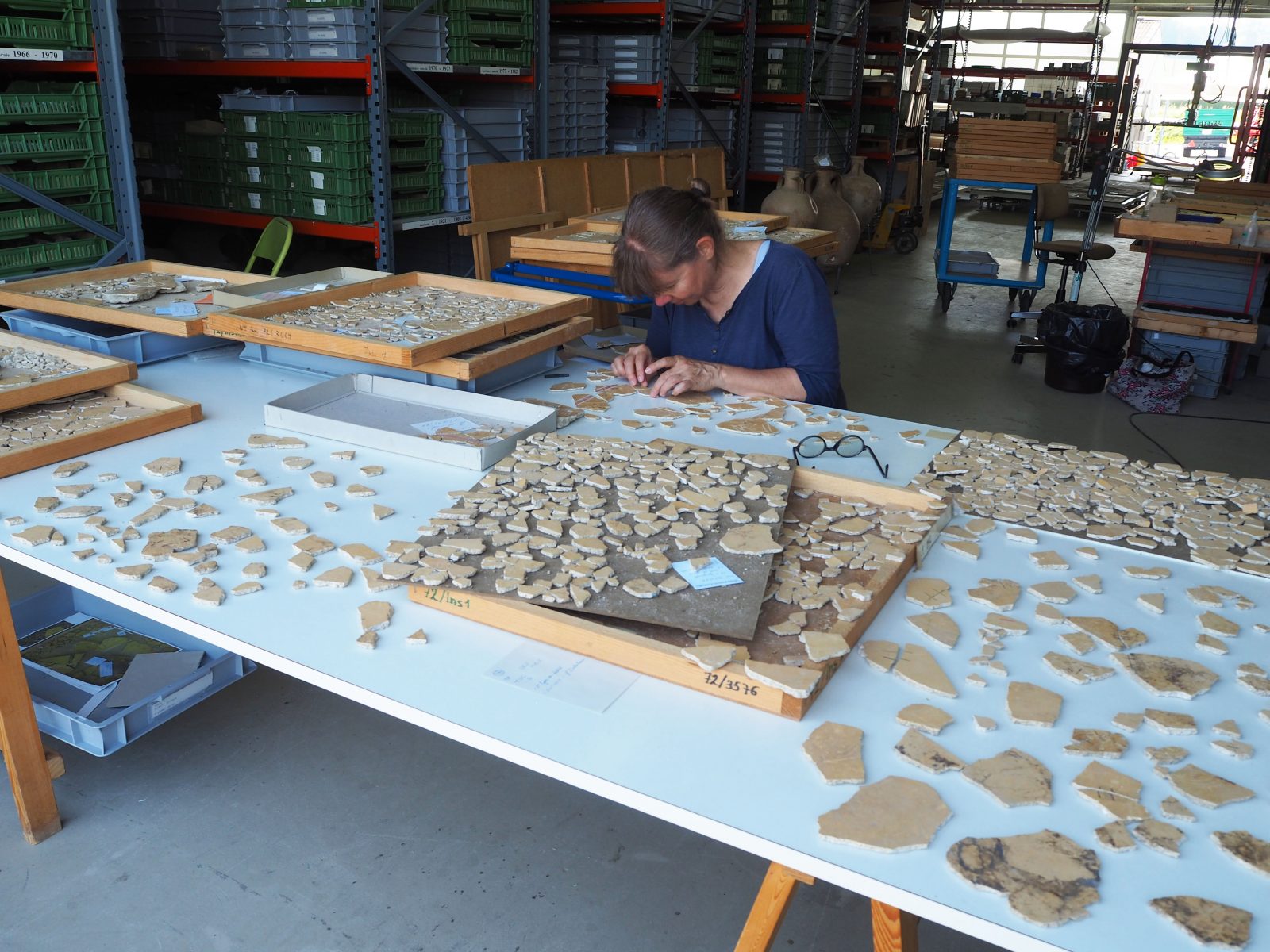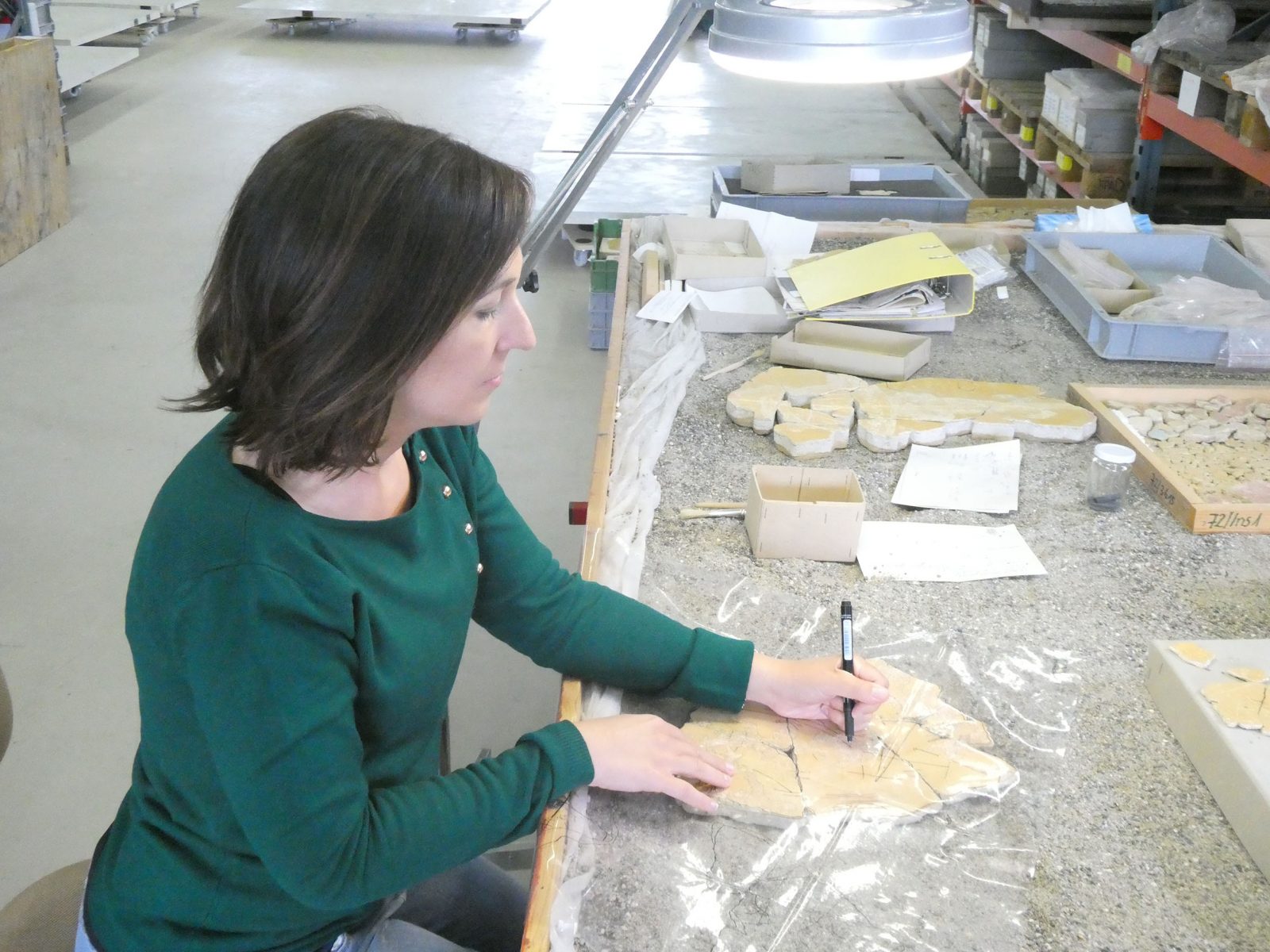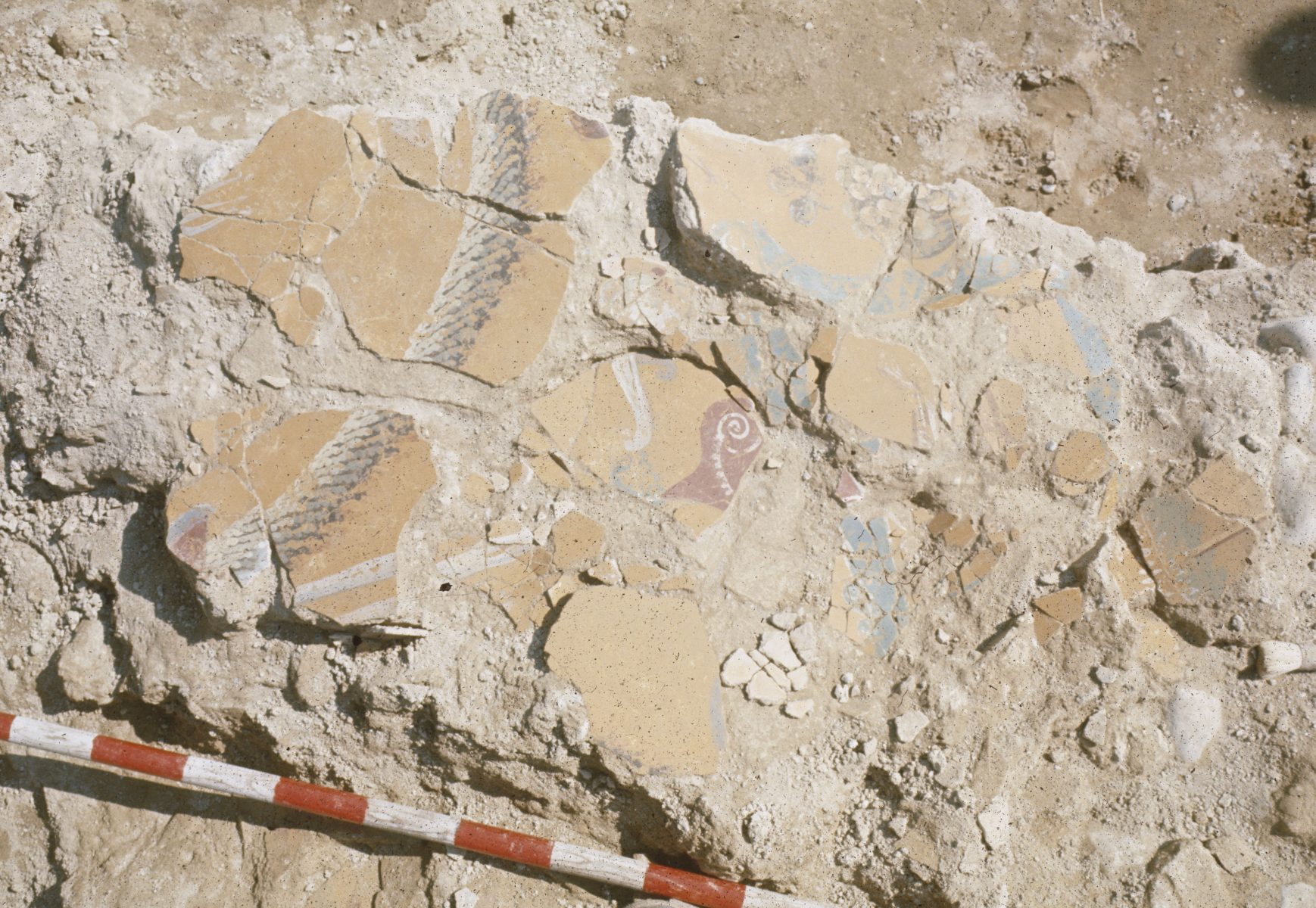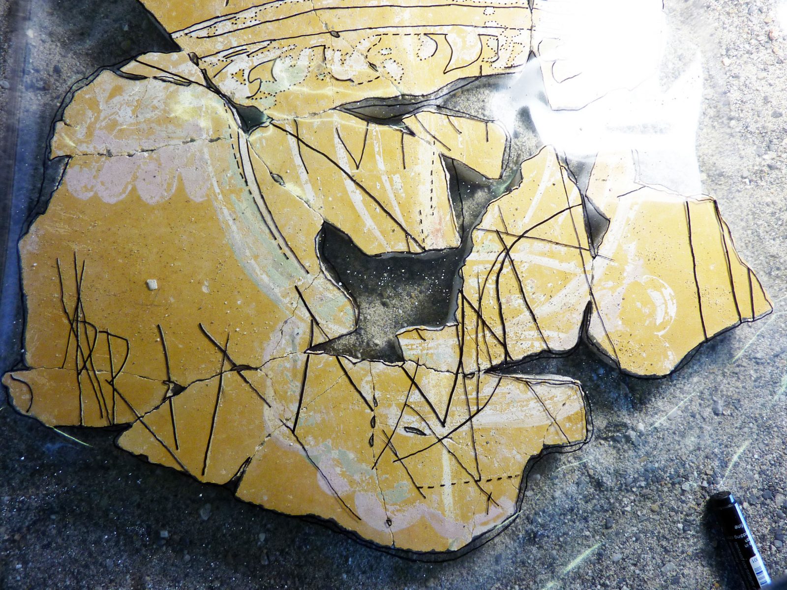 Prélevés en 1972 sur le sol de la pièce alors dite « aux fresques », située dans l’aile est de la domus, les nombreux fragments d’enduits peints à fond jaune sont conditionnés sur quelque 120 plateaux de bois recouvrant une surface de 25m2. Ce décor a fait l’objet d’une étude préliminaire dans les années 1980 par Michel Fuchs et trois panneaux furent restaurés et présentés au Musée romain d’Avenches. Actuellement encore dans un état très fragmentaire, il nécessite une reconstitution exhaustive pour faciliter son étude approfondie, engagée dès 2017 après un nouveau nettoyage du matériel.