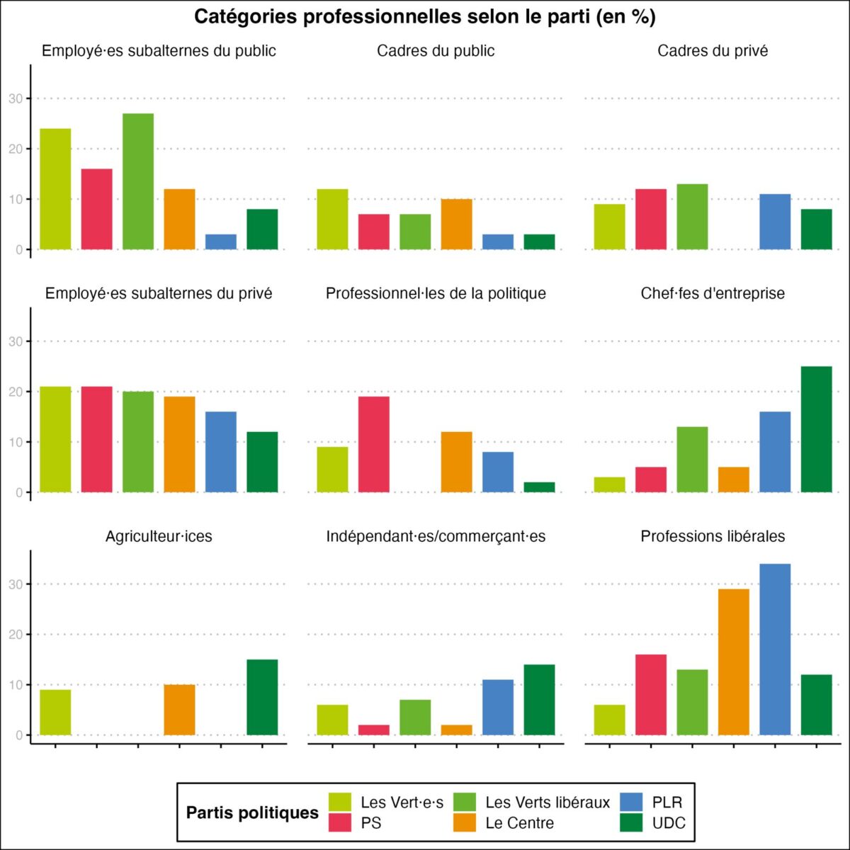 En se basant sur les données fournies par la Confédération suisse sur les parlementaires de la législature 2019-2023, qui donnent des indications biographiques multiples dont leur(s) profession(s), ce graphique tend à montrer la distribution des catégories professionnelles des élus selon leur affiliation politique. Nous avons distingué neuf catégories professionnelles dans lesquelles classer leurs occupations rémunérées (en dehors de leur activité de politicien.ne) : (1) les agriculteur.rices, (2) les cadres du privé, (3) les cadres du public, (4) les chef.fes d’entreprise, (5) les employé.es subalternes du public, (6) du privé, (7) les indépendant.es/commerçant.es, (8) les professionnels de la politique et (9) les professions libérales. Le code couleur se réfère aux couleurs officielles des six partis suisses représentés au Parlement.