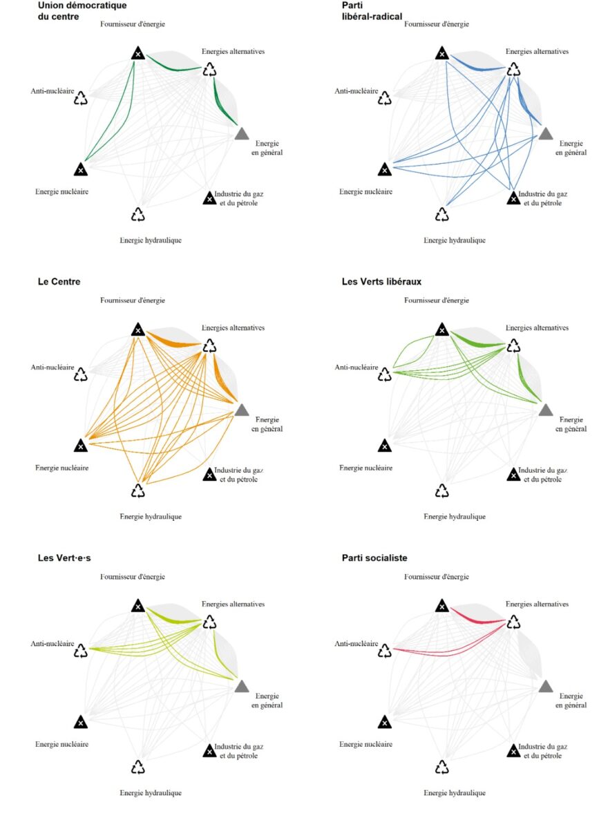 Le parti du centre affiche une présence notable, aussi bien dans les lobbys « Durables » (Fournisseur d’énergie, Énergie nucléaire) que dans les lobbys « Durables » (Énergies alternatives et Énergie hydraulique). En revanche, les Verts libéraux et les Verts se montrent peu présents, concentrés exclusivement dans les lobbys liés aux énergies alternatives, à l’anti-nucléaire, aux fournisseurs d’énergie, et à l’énergie en général. Enfin, le Parti socialiste apparaît très sporadiquement, établissant seulement quelques liens dans les domaines de l’anti-nucléaire, des énergies alternatives et des fournisseurs d’énergie.