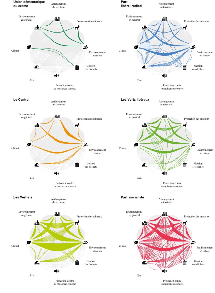 Ces graphiques permettent de comprendre quelles thématiques sont davantage mobilisées par chaque parti. Cependant, il est crucial de souligner que l’interprétation de ces données nécessite une approche nuancée. Les débats parlementaires présentent une tendance à reprendre des arguments entre les partis, que ce soit pour exprimer un accord ou une divergence. Ainsi, une fréquence élevée de mobilisation d’une thématique ne signifie pas nécessairement que le parti est particulièrement favorable ou opposé à celle-ci, mais plutôt une propension à la mobiliser et à la réutiliser pendant les débats.