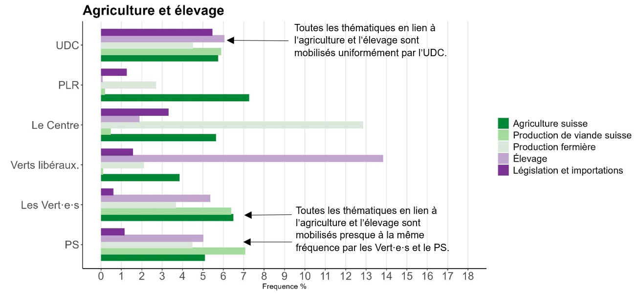 Passons maintenant au graphique « Agriculture et élevage ». L’élément le plus frappant réside dans l’uniformité presque totale de la mobilisation des différentes thématiques par l’UDC. En d’autres termes, toutes les questions liées à l’agriculture et à l’élevage semblent avoir une importance équivalente pour ce parti, qui entretient des liens historiques étroits avec les milieux agricoles. Un autre élément intéressant à relever est la similarité entre les Vert·e·s et le PS quant à la fréquence à laquelle les thématiques sont mobilisées.