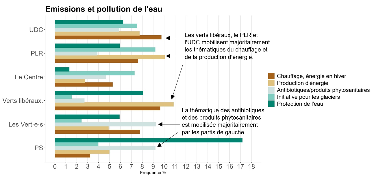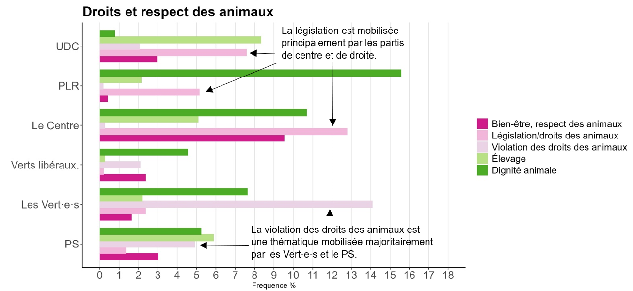 Enfin, pour ce qui est du graphique « Droits et respect des animaux », il est intéressant de noter que la thématique de la législation est davantage mobilisée par les partis du centre et de droite, peut-être en raison de leur position affirmant que la législation en vigueur est déjà assez contraignante. La gauche, quant à elle, mobilise davantage la thématique de la violation des droits des animaux.