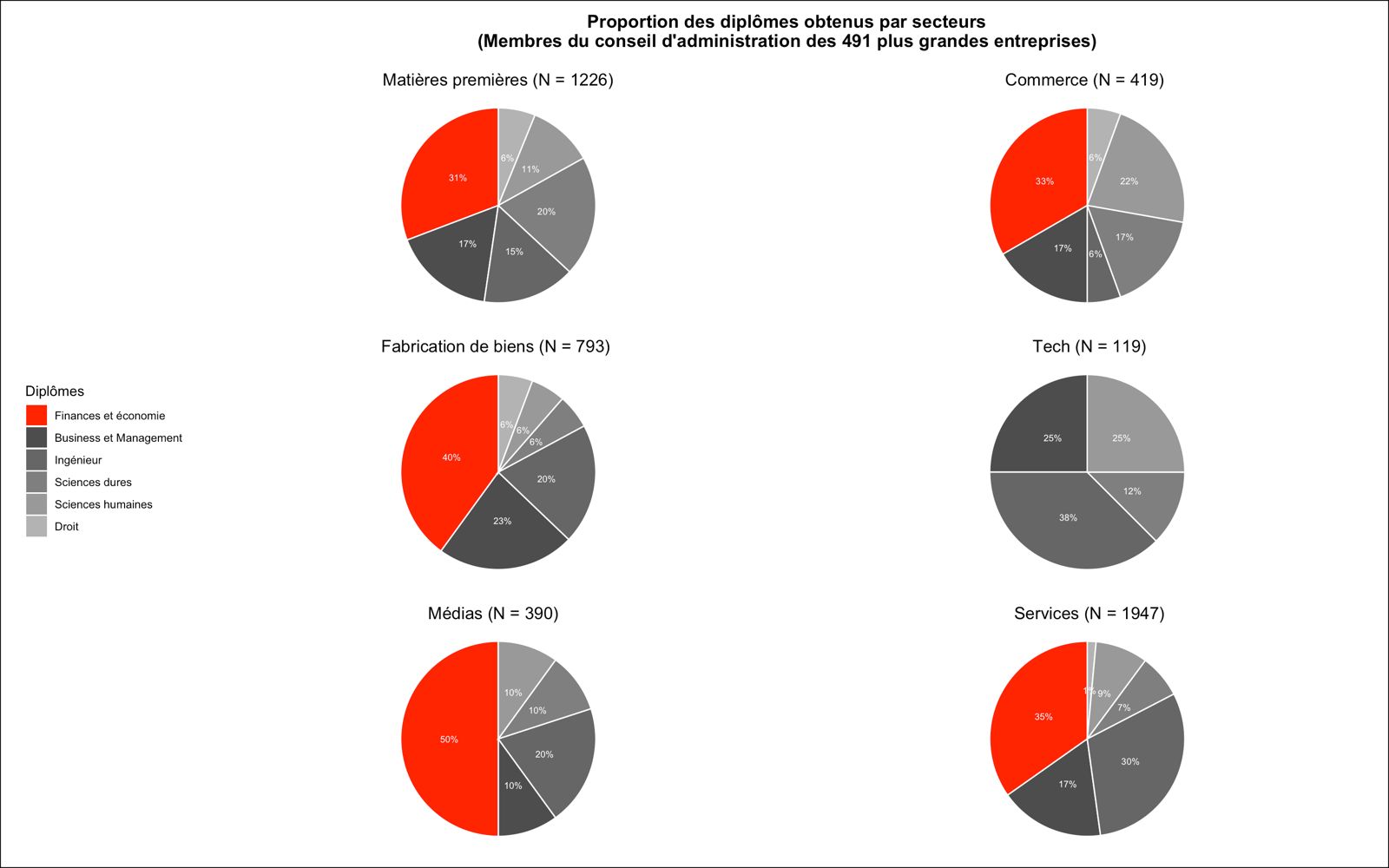 Les études en « Finance et économie » sont les plus représentées. À l’inverse, dans le secteur « Tech », ces études sont totalement absentes, cela peut suggérer une nouvelle forme d’élite représentant la modernité technologique, exigeant des études d’ingénierie. Le secteur « Matières premières », quant à lui, ne représente aucune particularité, il est similaire aux autres secteurs.