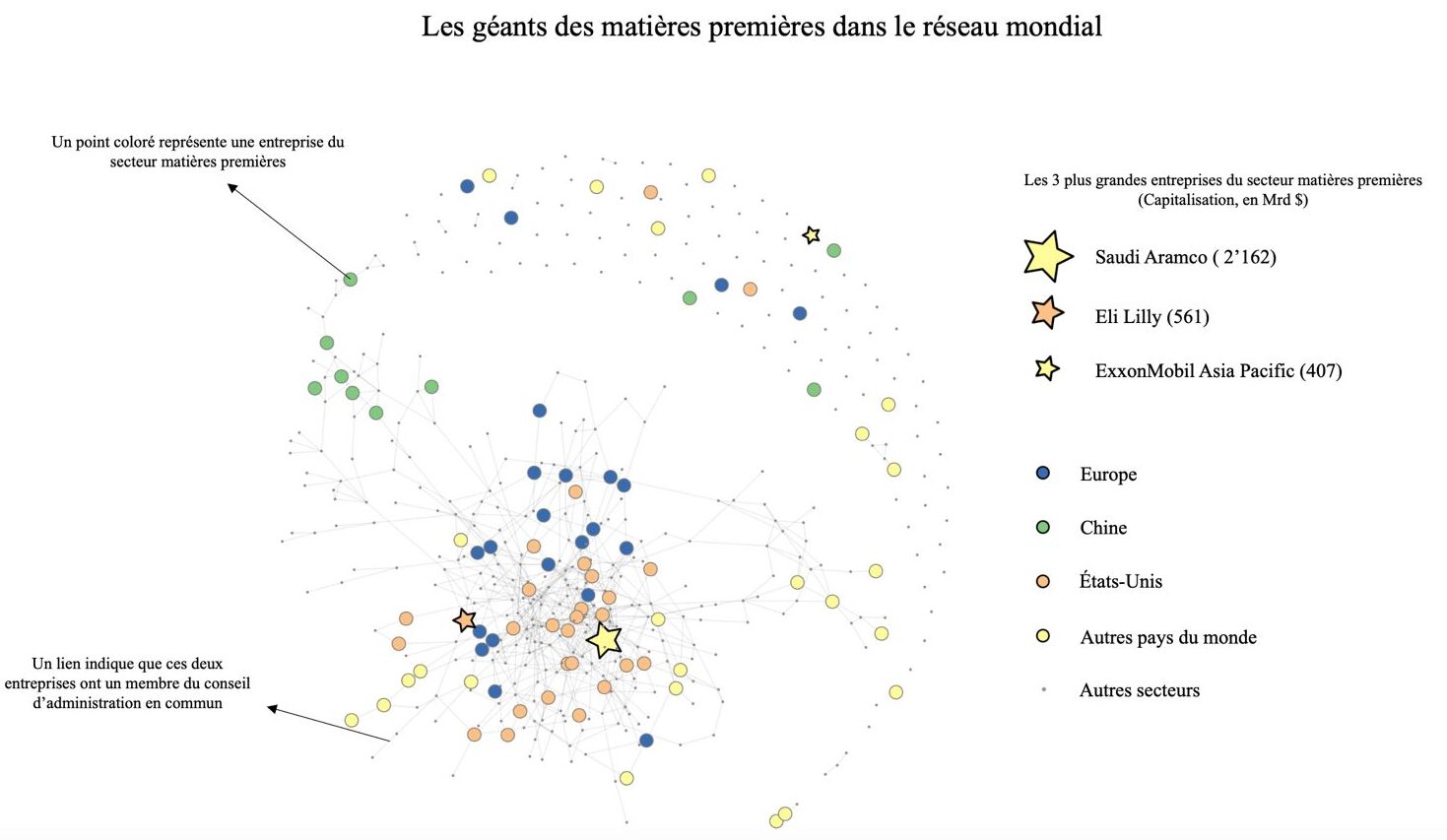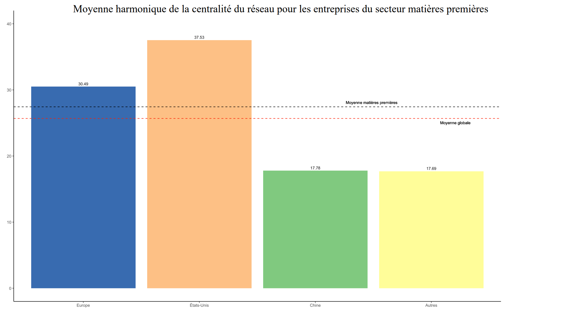 Dans le graphique ci-dessus, les entreprises du secteur « Matières premières » sont au cœur du réseau des plus grandes entreprises. Tout de même, une nette différence se voit selon leur nationalité. Malgré qu’elles soient reliées au cluster principale les entreprises chinoises sont moins importantes et centrales dans le réseau mondial que les entreprises européennes et américaines.