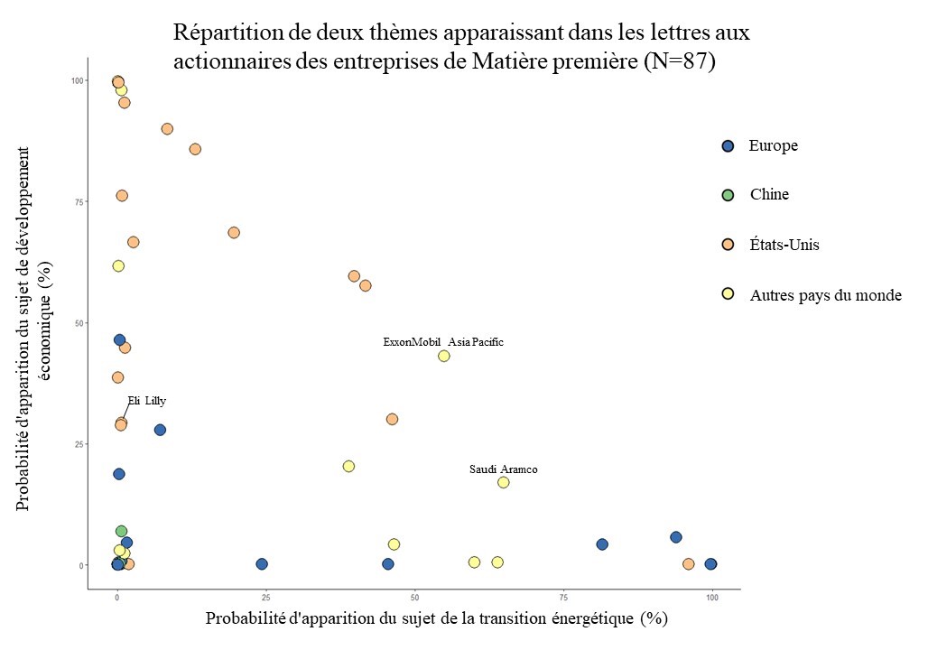 Ce graphique met en évidence une relation négative entre le thème du développement économique et la transition énergétique. En effet, plus les lettres aux actionnaires parlent de développement économique moins l’on retrouve le thème de la transition énergétique et vice versa. Cela suggère que les entreprises communiquent des informations concernant leur performances économique de l’année, soit des aspirations écologiques pour l’année suivant ou leur efforts écologiques qui ont été fait, il y a une prioritarisation d’un thème sur l’autre.