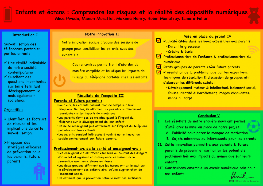 Catégories Posters Enfants et écrans : Comprendre les risques et la réalité des dispositifs numériques Auteur de l’article Par Eléonore Petit Date de l’article 22 octobre 2024 Étiquettes éducation, Enfants, GESC, Numérique ← Fast fashion et surconsommation : sensibiliser pour agir → Sur utilisation du smartphone par les adolescents: les répercussions sur la santé