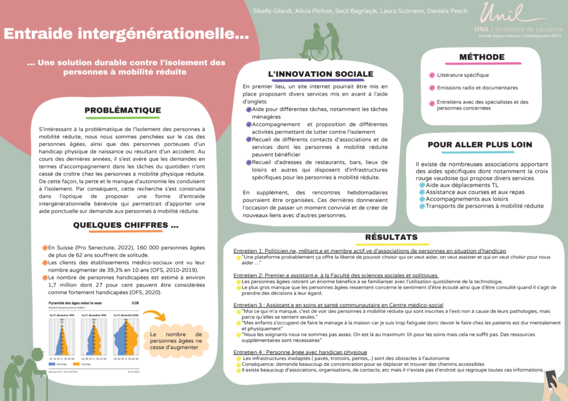 Catégories Posters Entraide intergénérationnelle…Une solution durable contre l’isolement des personnes à mobilité réduite Auteur de l’article Par Eléonore Petit Date de l’article 5 septembre 2023 Étiquettes Entraide, GESC, Isolement, mobilité réduite, Solidarité ← Précarité et non-recours aux aides sociales ; le cas de la ville de Lausanne → SLL ; Socialisation learning languages