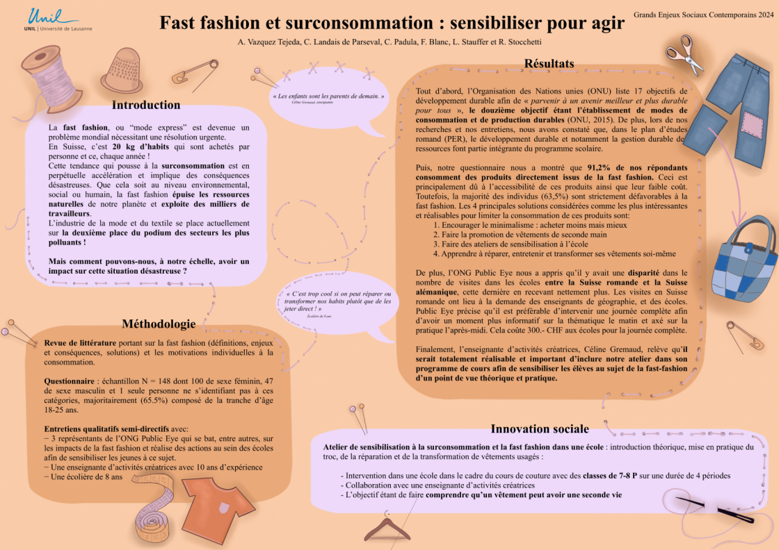 Catégories Posters Fast fashion et surconsommation : sensibiliser pour agir Auteur de l’article Par Eléonore Petit Date de l’article 22 octobre 2024 Étiquettes Consommation, Fashion, GESC, Prévention ← La fast fashion en Suisse : quelles solutions pour diminuer la surconsommation ? → Enfants et écrans : Comprendre les risques et la réalité des dispositifs numériques