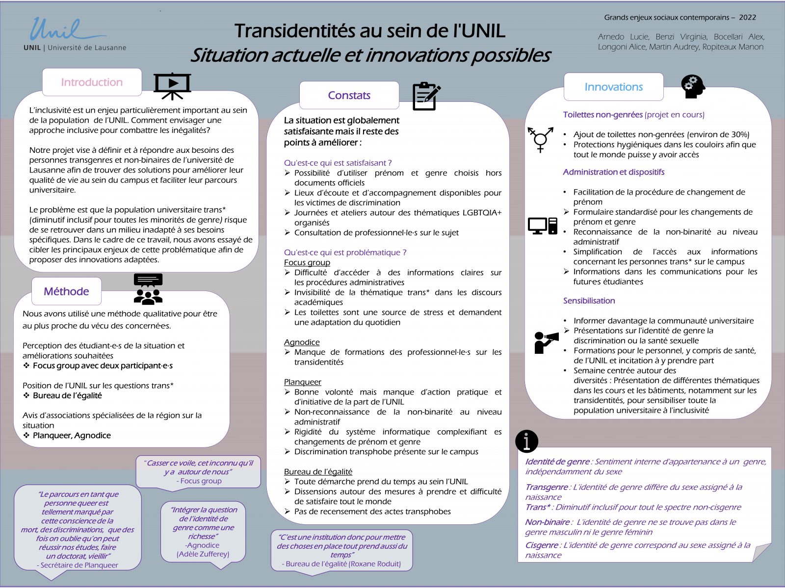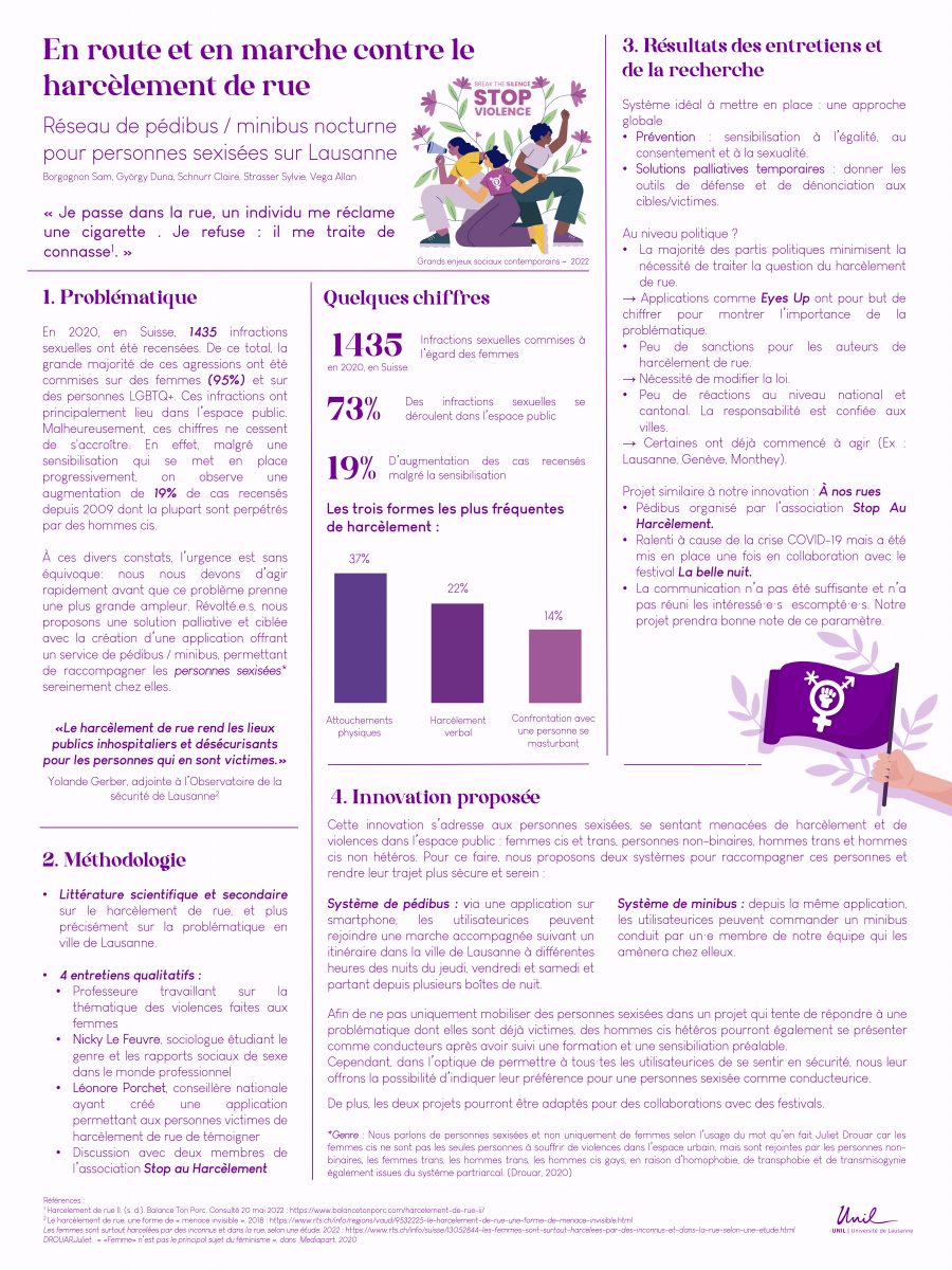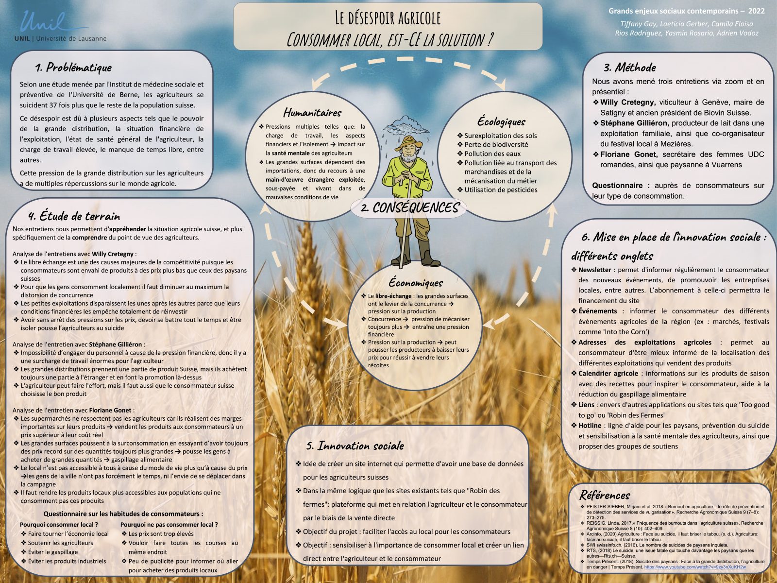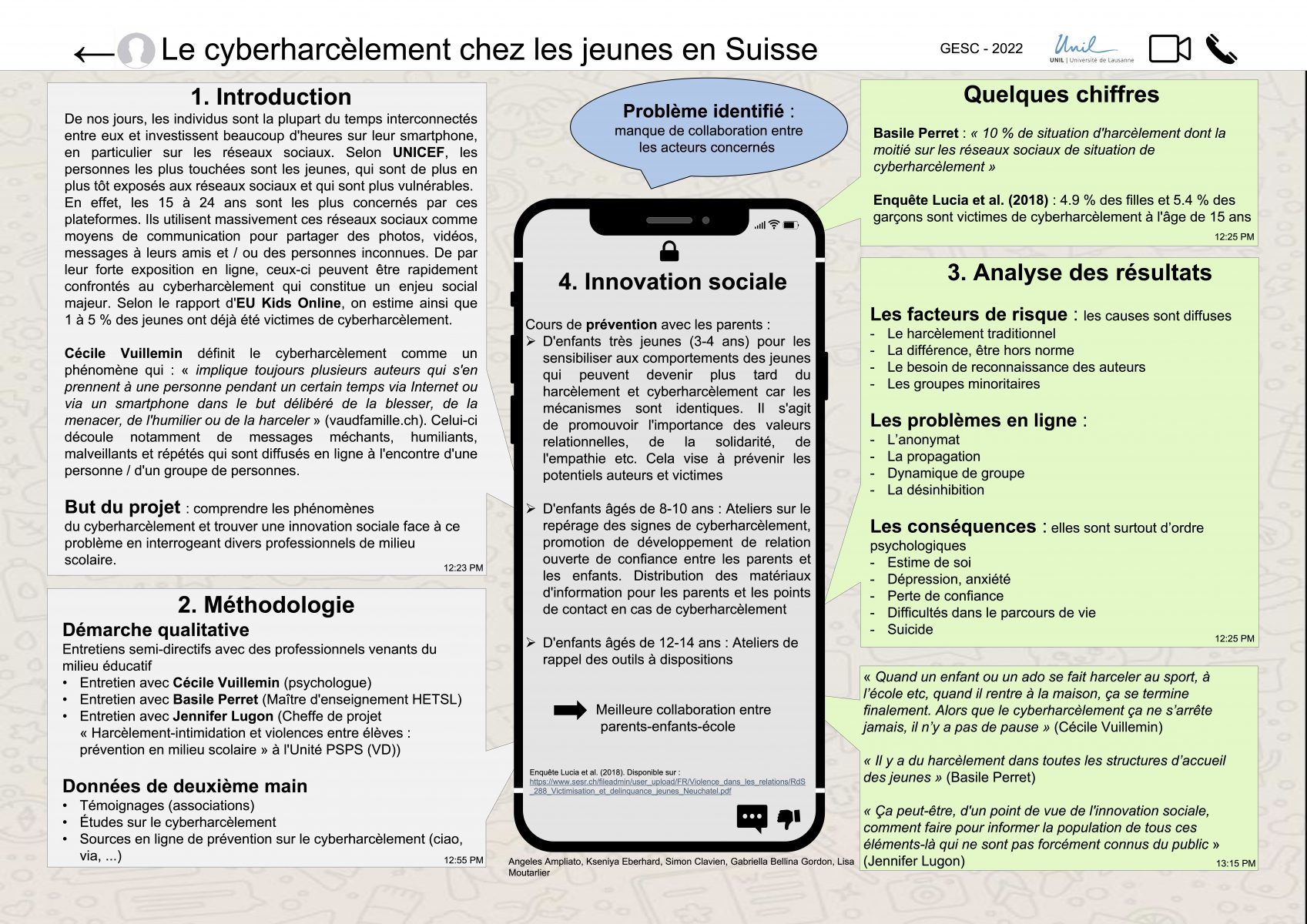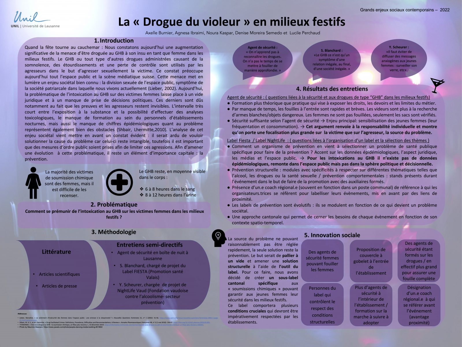 GESC 2022 Retrouvez sur cette page tous les travaux réalisés par les étudiant·es du cours Grands Enjeux Sociaux Contemporains (GESC) au cours du semestre de printemps 2022. Posters des étudiant·es Quelle place en tant que femme dans un milieu professionnel genré masculin ? Sensibiliser aux troubles de la santé mentale en période périnatale Promoting sexual education in Rio de Janeiro Spiking After Bangalore, entre défis et innovations Les réseaux de partage d’images suggestives ou sexuelles : une libération pour la femme ou un danger potentiel ? Les problèmes éthiques derrière les organisations humanitaires L’ubérisation et ses conséquences : approche par le cas d’une société de livraison à domicile La prise en charge de l’endométriose en Suisse : de la méconnaissance à la reconnaissance de la maladie Enseignement obligatoire traditionnel déficitaire face aux défis actuels ? L’accessibilité : tou·te·s concerné·e·s Les violences gynécologiques La friperie comme alternative écologique à la fast-fashion Accès à la Terre pour toustes. Diffusion d’un savoir environnemental Comment les boîtes de nuit gèrent-elles le phénomène de GHB au sein de leurs établissements ? Les inégalités de genre dans les pratiques sportives Réunir Bangalore autour de l’eau Comment la pandémie a impacté l’anxiété sociale chez les jeunes suisses ? Des étudiantexs pas dans leur assiette. Une approche non-moralisatrice contre le gaspillage alimentaire étudiant Harcèlement scolaire : l’intégrer pour mieux le dissiper ? La communication à l’appui de l’accueil des réfugiés ukrainiens au sein du Canton de Vaud La précarité étudiante. Le problème de la conciliation études-travail Prostitution en Ville de Lausanne. Rue de Genève. La « Drogue du violeur » en milieux festifs Contraception masculine hormonale. (Re)production des inégalités de genre : idées reçues et réalité Le désespoir agricole. Consommer local, est-ce la solution ? Impact des réseaux sociaux sur l’image corporelle des jeunes Le cyberharcèlement chez les jeunes en Suisse Le coût de la viande. Production et consommation extrême de la viande. Précarité alimentaire : zoom sur la situation estudiantine @Ados.et.Désinfo Transidentités au sein de l’UNIL. Situation actuelle et innovations possibles Réinvestir l’espace public et le foyer ? Réduisons le temps de travail En route et en marche contre le harcèlement de rue Agent.x.e.s de sécurité et monde de la nuit. Améliorer l’expérience nocturne lausannoise par la formation Women security in the public area Précarité et alimentation. Un « Too Good To Go » de l’UNIL
