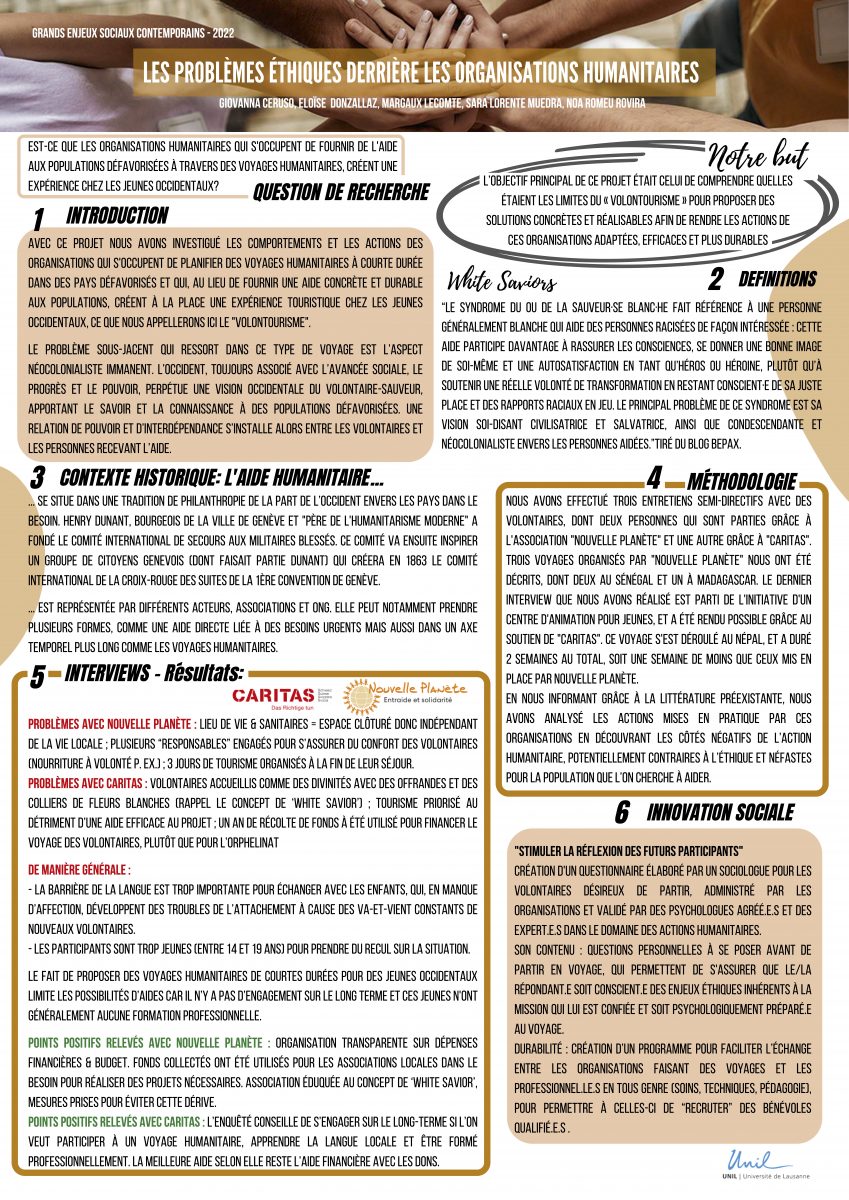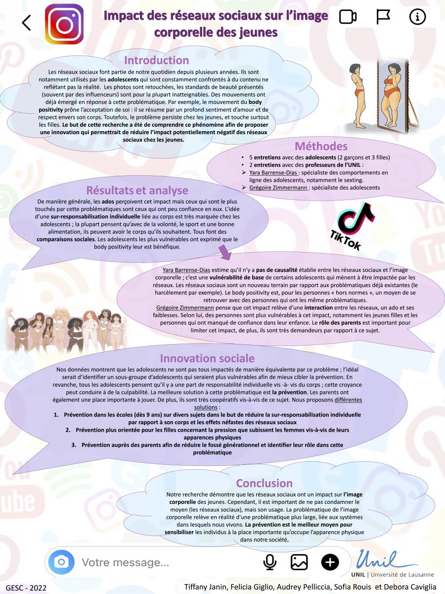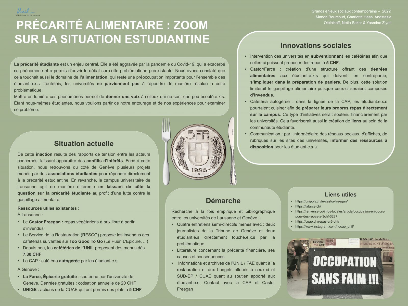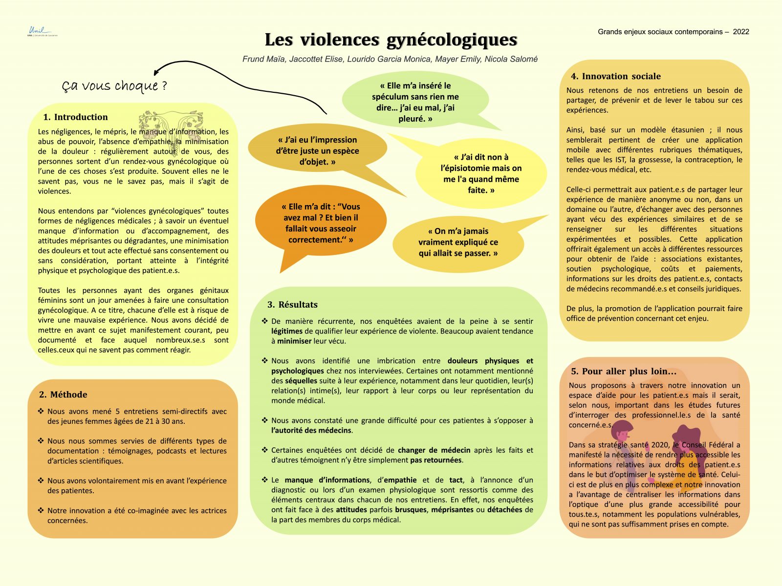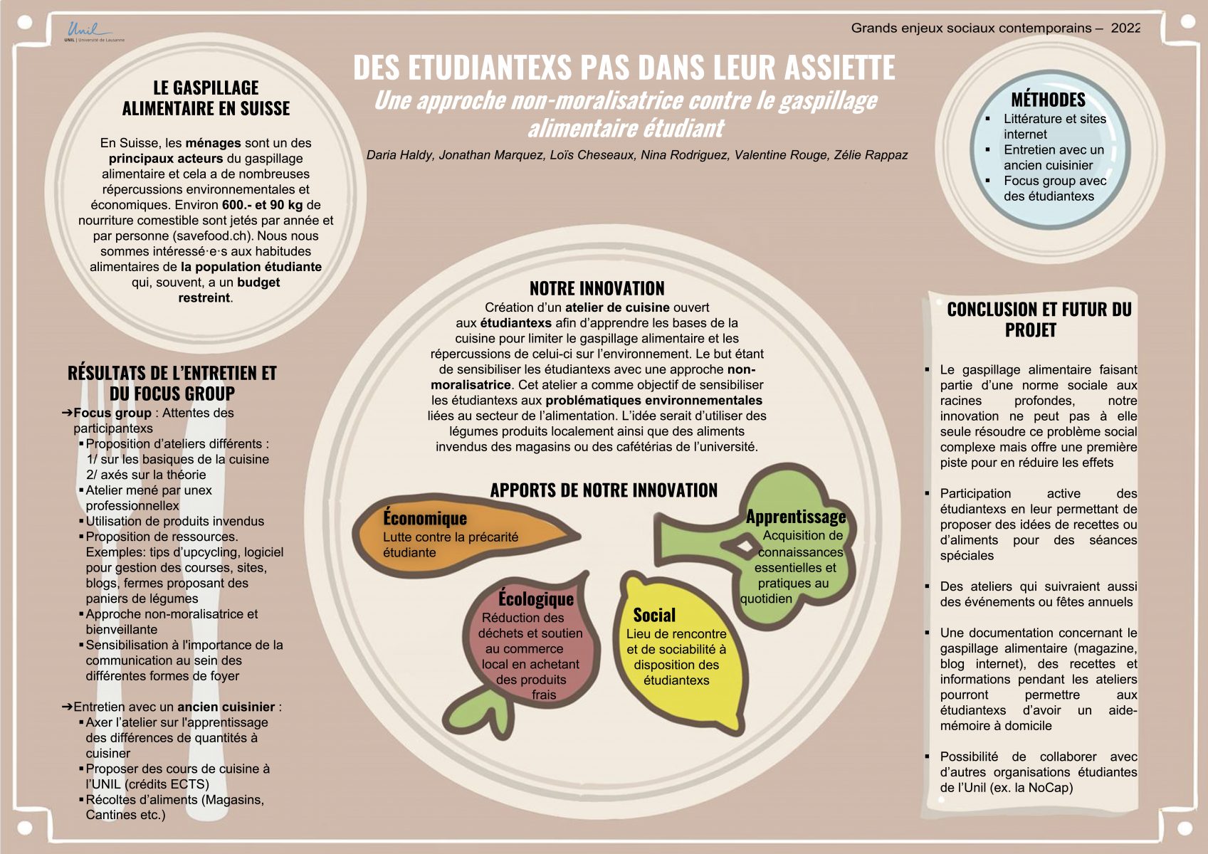 GESC 2022 Retrouvez sur cette page tous les travaux réalisés par les étudiant·es du cours Grands Enjeux Sociaux Contemporains (GESC) au cours du semestre de printemps 2022. Posters des étudiant·es Quelle place en tant que femme dans un milieu professionnel genré masculin ? Sensibiliser aux troubles de la santé mentale en période périnatale Promoting sexual education in Rio de Janeiro Spiking After Bangalore, entre défis et innovations Les réseaux de partage d’images suggestives ou sexuelles : une libération pour la femme ou un danger potentiel ? Les problèmes éthiques derrière les organisations humanitaires L’ubérisation et ses conséquences : approche par le cas d’une société de livraison à domicile La prise en charge de l’endométriose en Suisse : de la méconnaissance à la reconnaissance de la maladie Enseignement obligatoire traditionnel déficitaire face aux défis actuels ? L’accessibilité : tou·te·s concerné·e·s Les violences gynécologiques La friperie comme alternative écologique à la fast-fashion Accès à la Terre pour toustes. Diffusion d’un savoir environnemental Comment les boîtes de nuit gèrent-elles le phénomène de GHB au sein de leurs établissements ? Les inégalités de genre dans les pratiques sportives Réunir Bangalore autour de l’eau Comment la pandémie a impacté l’anxiété sociale chez les jeunes suisses ? Des étudiantexs pas dans leur assiette. Une approche non-moralisatrice contre le gaspillage alimentaire étudiant Harcèlement scolaire : l’intégrer pour mieux le dissiper ? La communication à l’appui de l’accueil des réfugiés ukrainiens au sein du Canton de Vaud La précarité étudiante. Le problème de la conciliation études-travail Prostitution en Ville de Lausanne. Rue de Genève. La « Drogue du violeur » en milieux festifs Contraception masculine hormonale. (Re)production des inégalités de genre : idées reçues et réalité Le désespoir agricole. Consommer local, est-ce la solution ? Impact des réseaux sociaux sur l’image corporelle des jeunes Le cyberharcèlement chez les jeunes en Suisse Le coût de la viande. Production et consommation extrême de la viande. Précarité alimentaire : zoom sur la situation estudiantine @Ados.et.Désinfo Transidentités au sein de l’UNIL. Situation actuelle et innovations possibles Réinvestir l’espace public et le foyer ? Réduisons le temps de travail En route et en marche contre le harcèlement de rue Agent.x.e.s de sécurité et monde de la nuit. Améliorer l’expérience nocturne lausannoise par la formation Women security in the public area Précarité et alimentation. Un « Too Good To Go » de l’UNIL