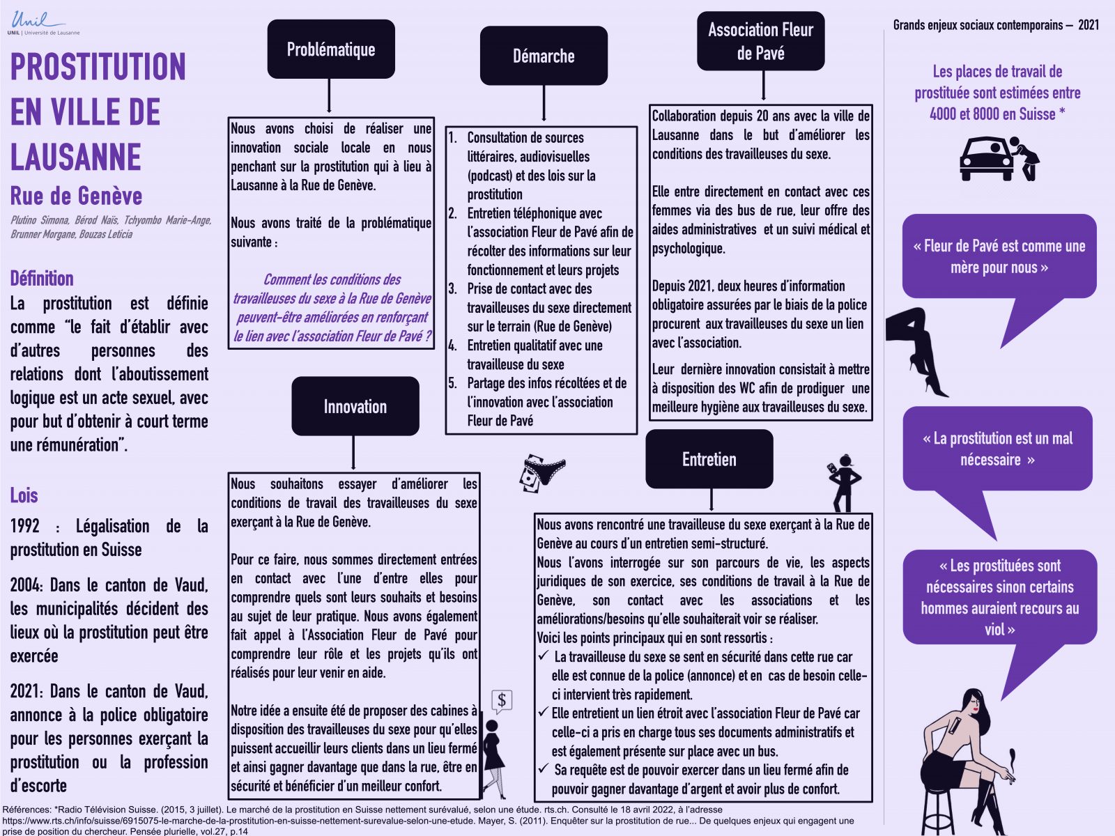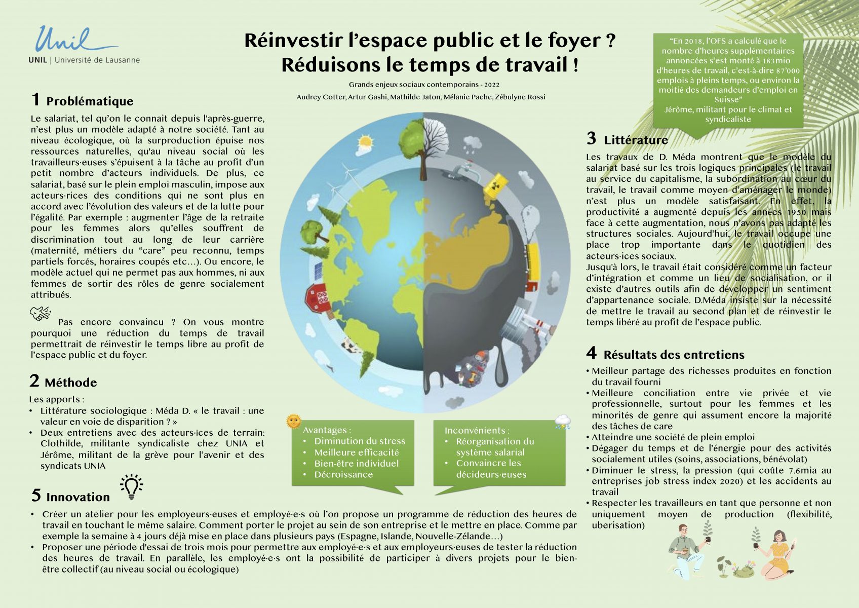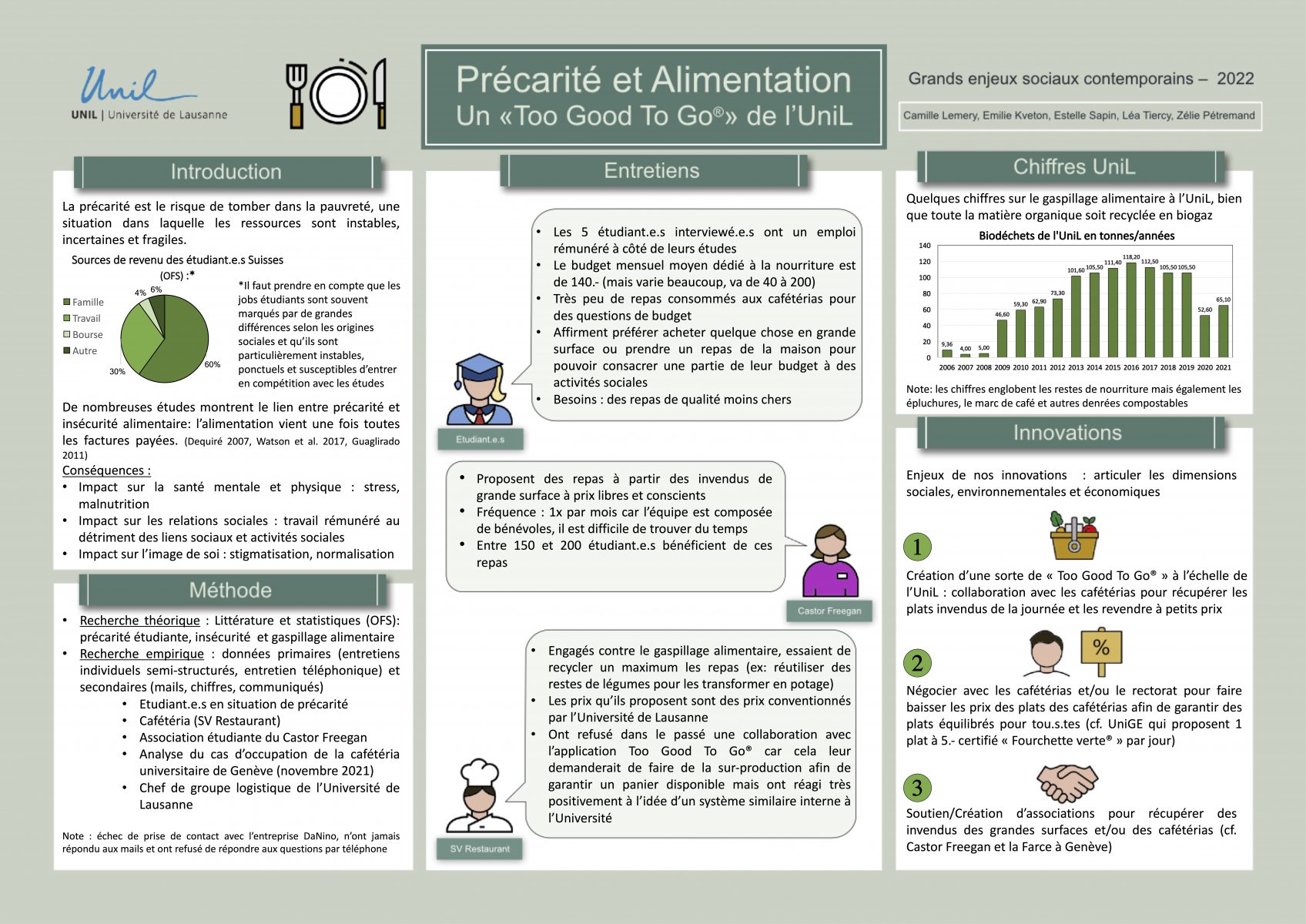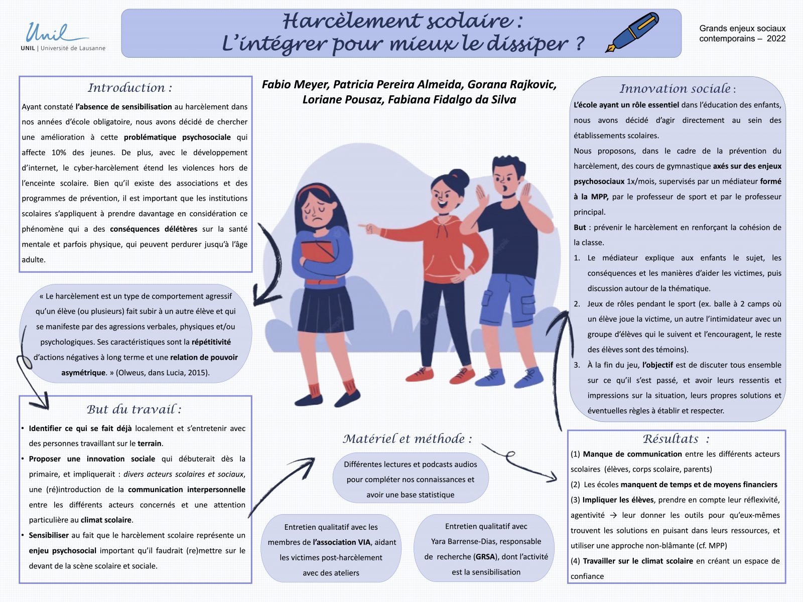 GESC 2022 Retrouvez sur cette page tous les travaux réalisés par les étudiant·es du cours Grands Enjeux Sociaux Contemporains (GESC) au cours du semestre de printemps 2022. Posters des étudiant·es Quelle place en tant que femme dans un milieu professionnel genré masculin ? Sensibiliser aux troubles de la santé mentale en période périnatale Promoting sexual education in Rio de Janeiro Spiking After Bangalore, entre défis et innovations Les réseaux de partage d’images suggestives ou sexuelles : une libération pour la femme ou un danger potentiel ? Les problèmes éthiques derrière les organisations humanitaires L’ubérisation et ses conséquences : approche par le cas d’une société de livraison à domicile La prise en charge de l’endométriose en Suisse : de la méconnaissance à la reconnaissance de la maladie Enseignement obligatoire traditionnel déficitaire face aux défis actuels ? L’accessibilité : tou·te·s concerné·e·s Les violences gynécologiques La friperie comme alternative écologique à la fast-fashion Accès à la Terre pour toustes. Diffusion d’un savoir environnemental Comment les boîtes de nuit gèrent-elles le phénomène de GHB au sein de leurs établissements ? Les inégalités de genre dans les pratiques sportives Réunir Bangalore autour de l’eau Comment la pandémie a impacté l’anxiété sociale chez les jeunes suisses ? Des étudiantexs pas dans leur assiette. Une approche non-moralisatrice contre le gaspillage alimentaire étudiant Harcèlement scolaire : l’intégrer pour mieux le dissiper ? La communication à l’appui de l’accueil des réfugiés ukrainiens au sein du Canton de Vaud La précarité étudiante. Le problème de la conciliation études-travail Prostitution en Ville de Lausanne. Rue de Genève. La « Drogue du violeur » en milieux festifs Contraception masculine hormonale. (Re)production des inégalités de genre : idées reçues et réalité Le désespoir agricole. Consommer local, est-ce la solution ? Impact des réseaux sociaux sur l’image corporelle des jeunes Le cyberharcèlement chez les jeunes en Suisse Le coût de la viande. Production et consommation extrême de la viande. Précarité alimentaire : zoom sur la situation estudiantine @Ados.et.Désinfo Transidentités au sein de l’UNIL. Situation actuelle et innovations possibles Réinvestir l’espace public et le foyer ? Réduisons le temps de travail En route et en marche contre le harcèlement de rue Agent.x.e.s de sécurité et monde de la nuit. Améliorer l’expérience nocturne lausannoise par la formation Women security in the public area Précarité et alimentation. Un « Too Good To Go » de l’UNIL