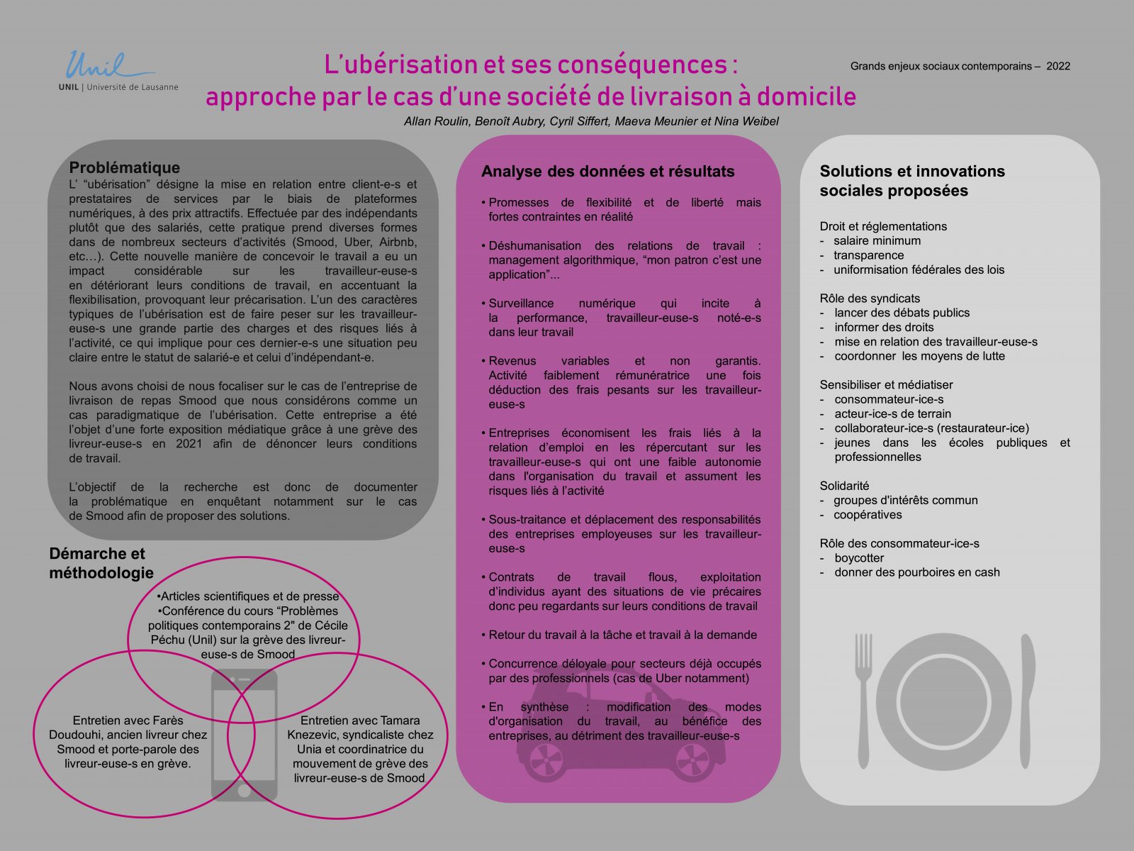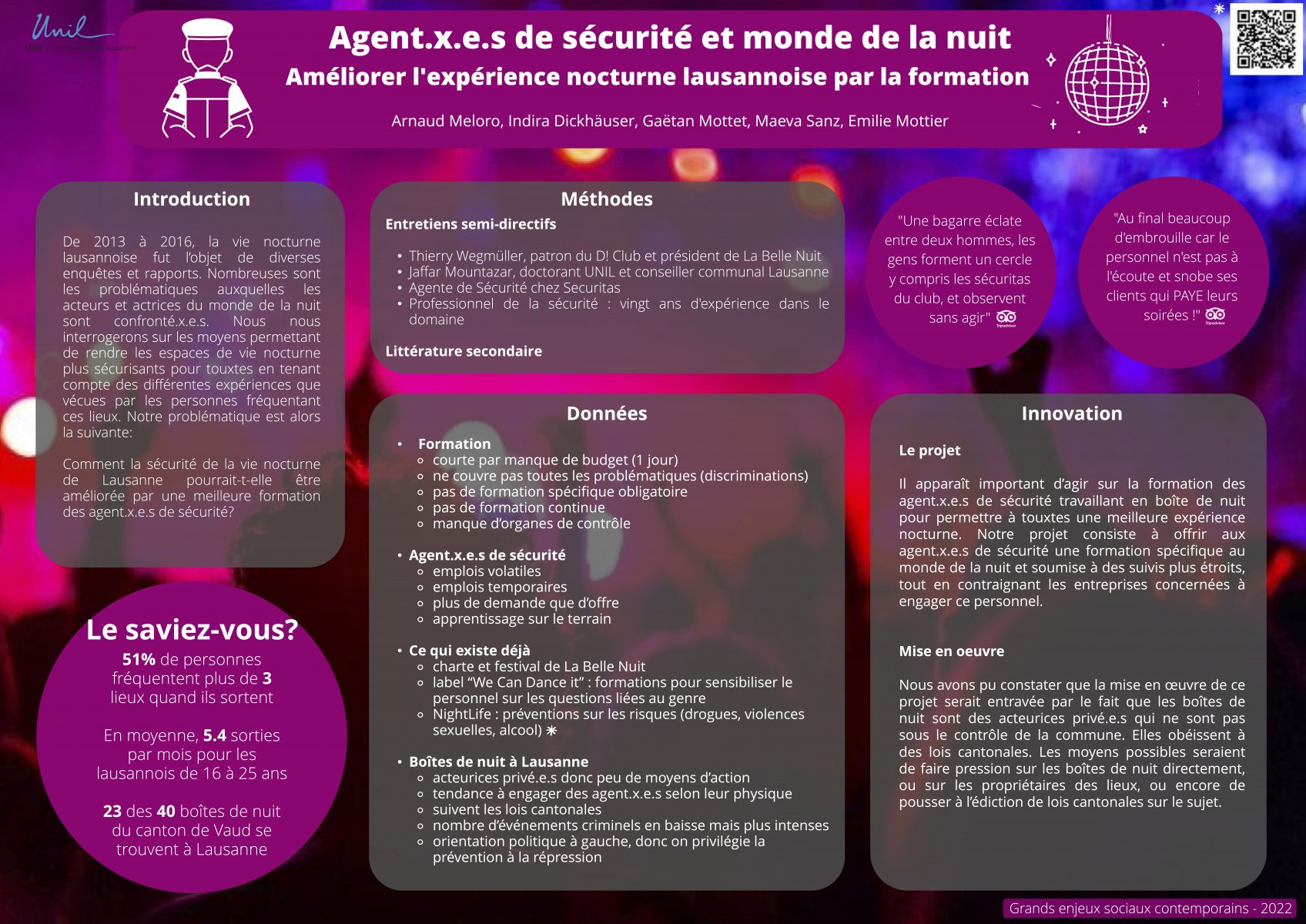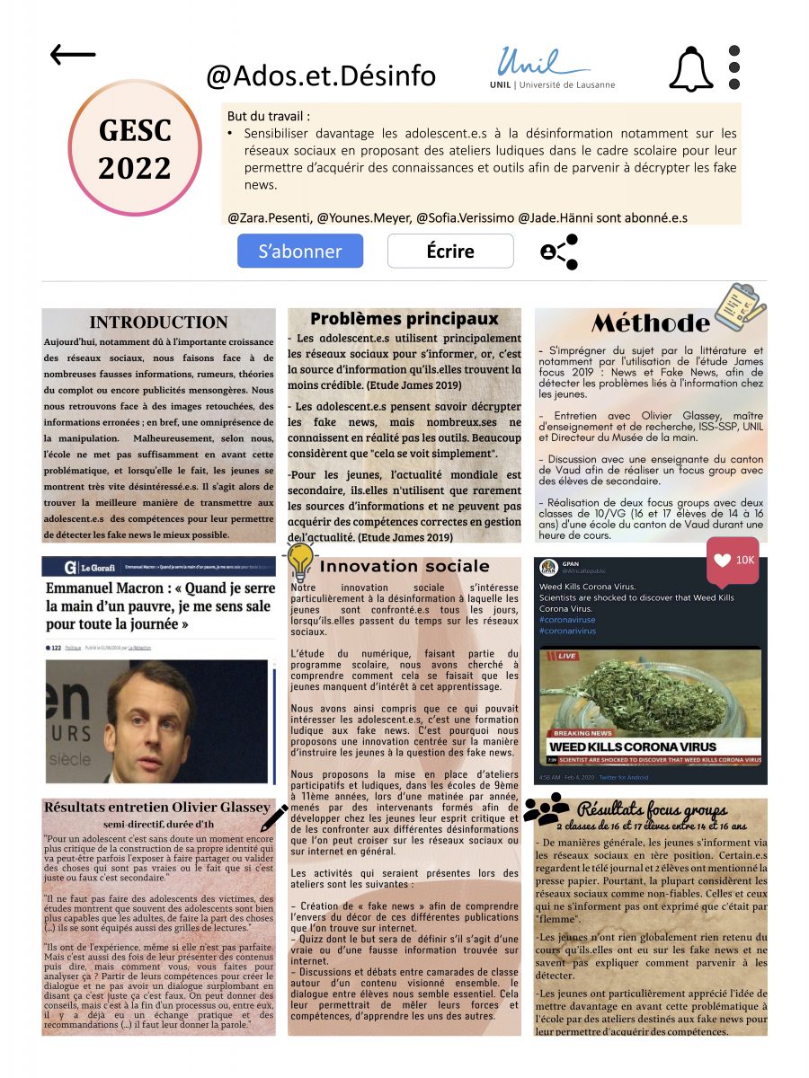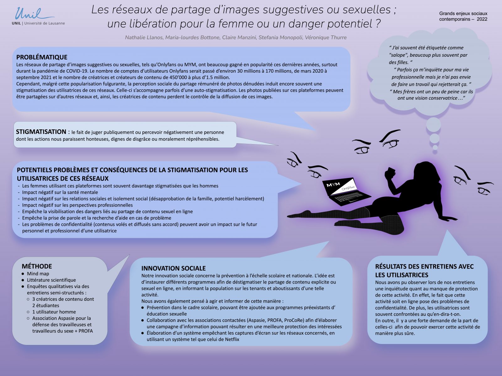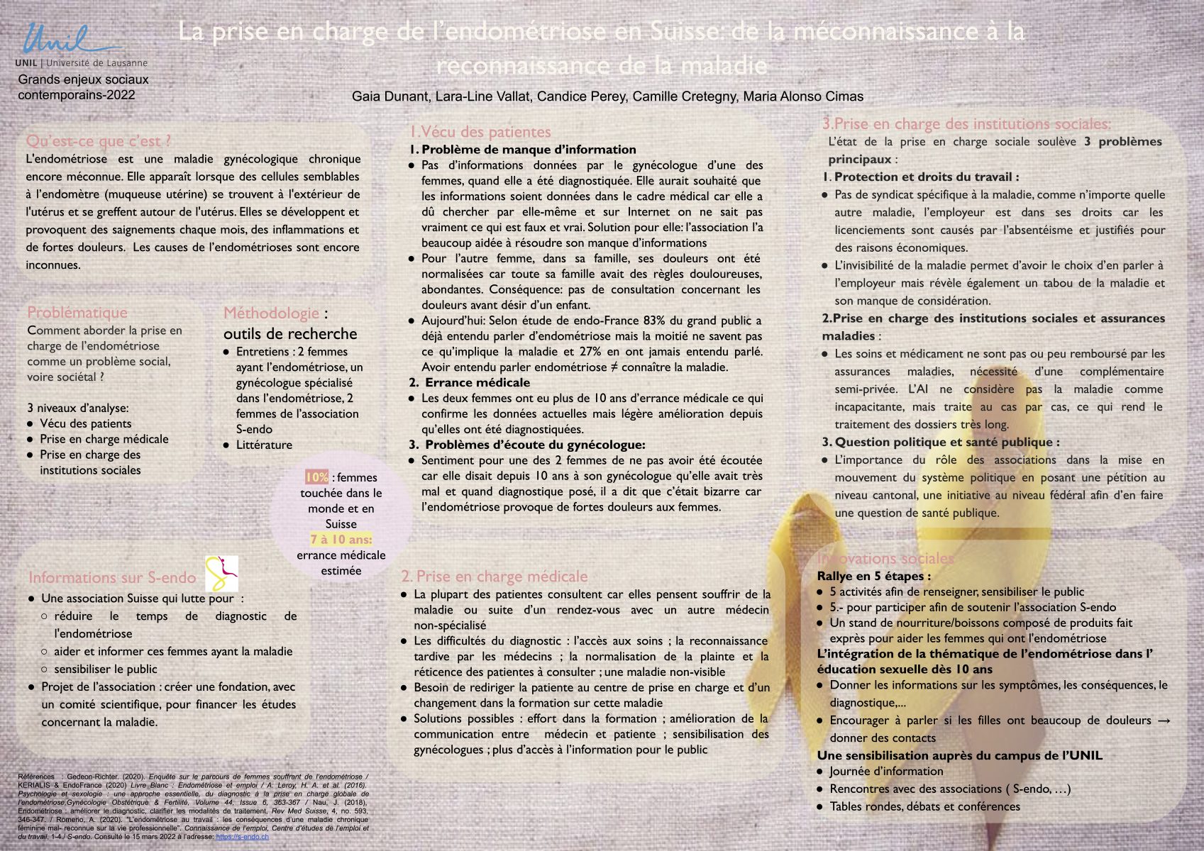 GESC 2022 Retrouvez sur cette page tous les travaux réalisés par les étudiant·es du cours Grands Enjeux Sociaux Contemporains (GESC) au cours du semestre de printemps 2022. Posters des étudiant·es Quelle place en tant que femme dans un milieu professionnel genré masculin ? Sensibiliser aux troubles de la santé mentale en période périnatale Promoting sexual education in Rio de Janeiro Spiking After Bangalore, entre défis et innovations Les réseaux de partage d’images suggestives ou sexuelles : une libération pour la femme ou un danger potentiel ? Les problèmes éthiques derrière les organisations humanitaires L’ubérisation et ses conséquences : approche par le cas d’une société de livraison à domicile La prise en charge de l’endométriose en Suisse : de la méconnaissance à la reconnaissance de la maladie Enseignement obligatoire traditionnel déficitaire face aux défis actuels ? L’accessibilité : tou·te·s concerné·e·s Les violences gynécologiques La friperie comme alternative écologique à la fast-fashion Accès à la Terre pour toustes. Diffusion d’un savoir environnemental Comment les boîtes de nuit gèrent-elles le phénomène de GHB au sein de leurs établissements ? Les inégalités de genre dans les pratiques sportives Réunir Bangalore autour de l’eau Comment la pandémie a impacté l’anxiété sociale chez les jeunes suisses ? Des étudiantexs pas dans leur assiette. Une approche non-moralisatrice contre le gaspillage alimentaire étudiant Harcèlement scolaire : l’intégrer pour mieux le dissiper ? La communication à l’appui de l’accueil des réfugiés ukrainiens au sein du Canton de Vaud La précarité étudiante. Le problème de la conciliation études-travail Prostitution en Ville de Lausanne. Rue de Genève. La « Drogue du violeur » en milieux festifs Contraception masculine hormonale. (Re)production des inégalités de genre : idées reçues et réalité Le désespoir agricole. Consommer local, est-ce la solution ? Impact des réseaux sociaux sur l’image corporelle des jeunes Le cyberharcèlement chez les jeunes en Suisse Le coût de la viande. Production et consommation extrême de la viande. Précarité alimentaire : zoom sur la situation estudiantine @Ados.et.Désinfo Transidentités au sein de l’UNIL. Situation actuelle et innovations possibles Réinvestir l’espace public et le foyer ? Réduisons le temps de travail En route et en marche contre le harcèlement de rue Agent.x.e.s de sécurité et monde de la nuit. Améliorer l’expérience nocturne lausannoise par la formation Women security in the public area Précarité et alimentation. Un « Too Good To Go » de l’UNIL