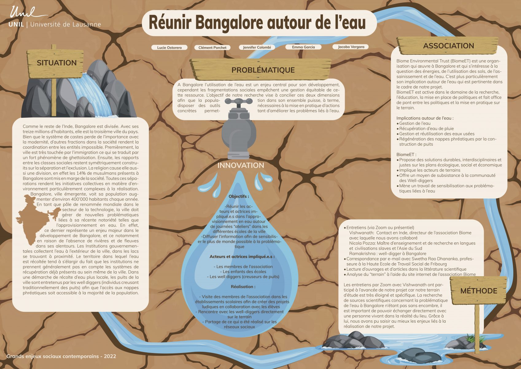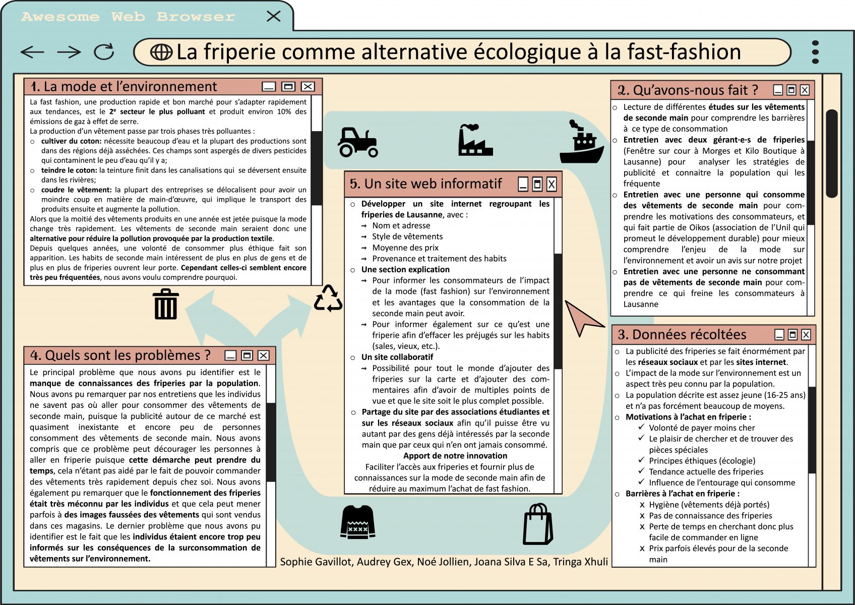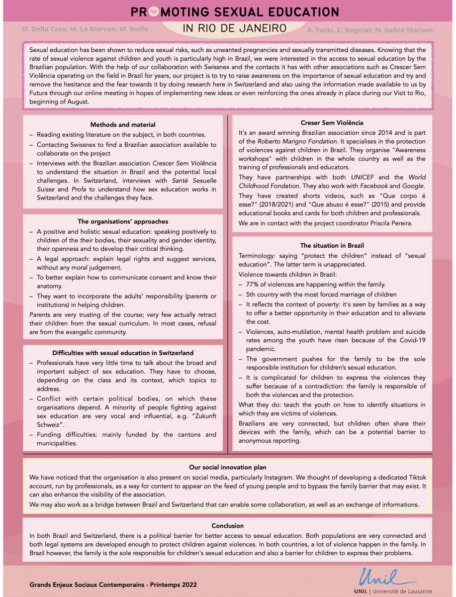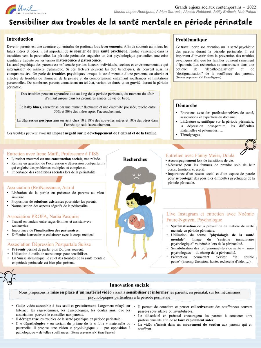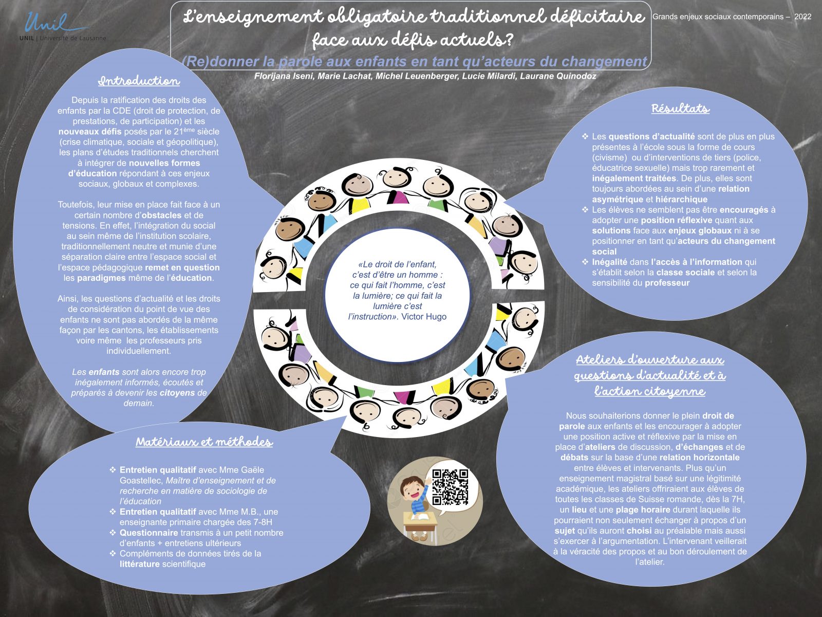 GESC 2022 Retrouvez sur cette page tous les travaux réalisés par les étudiant·es du cours Grands Enjeux Sociaux Contemporains (GESC) au cours du semestre de printemps 2022. Posters des étudiant·es Quelle place en tant que femme dans un milieu professionnel genré masculin ? Sensibiliser aux troubles de la santé mentale en période périnatale Promoting sexual education in Rio de Janeiro Spiking After Bangalore, entre défis et innovations Les réseaux de partage d’images suggestives ou sexuelles : une libération pour la femme ou un danger potentiel ? Les problèmes éthiques derrière les organisations humanitaires L’ubérisation et ses conséquences : approche par le cas d’une société de livraison à domicile La prise en charge de l’endométriose en Suisse : de la méconnaissance à la reconnaissance de la maladie Enseignement obligatoire traditionnel déficitaire face aux défis actuels ? L’accessibilité : tou·te·s concerné·e·s Les violences gynécologiques La friperie comme alternative écologique à la fast-fashion Accès à la Terre pour toustes. Diffusion d’un savoir environnemental Comment les boîtes de nuit gèrent-elles le phénomène de GHB au sein de leurs établissements ? Les inégalités de genre dans les pratiques sportives Réunir Bangalore autour de l’eau Comment la pandémie a impacté l’anxiété sociale chez les jeunes suisses ? Des étudiantexs pas dans leur assiette. Une approche non-moralisatrice contre le gaspillage alimentaire étudiant Harcèlement scolaire : l’intégrer pour mieux le dissiper ? La communication à l’appui de l’accueil des réfugiés ukrainiens au sein du Canton de Vaud La précarité étudiante. Le problème de la conciliation études-travail Prostitution en Ville de Lausanne. Rue de Genève. La « Drogue du violeur » en milieux festifs Contraception masculine hormonale. (Re)production des inégalités de genre : idées reçues et réalité Le désespoir agricole. Consommer local, est-ce la solution ? Impact des réseaux sociaux sur l’image corporelle des jeunes Le cyberharcèlement chez les jeunes en Suisse Le coût de la viande. Production et consommation extrême de la viande. Précarité alimentaire : zoom sur la situation estudiantine @Ados.et.Désinfo Transidentités au sein de l’UNIL. Situation actuelle et innovations possibles Réinvestir l’espace public et le foyer ? Réduisons le temps de travail En route et en marche contre le harcèlement de rue Agent.x.e.s de sécurité et monde de la nuit. Améliorer l’expérience nocturne lausannoise par la formation Women security in the public area Précarité et alimentation. Un « Too Good To Go » de l’UNIL