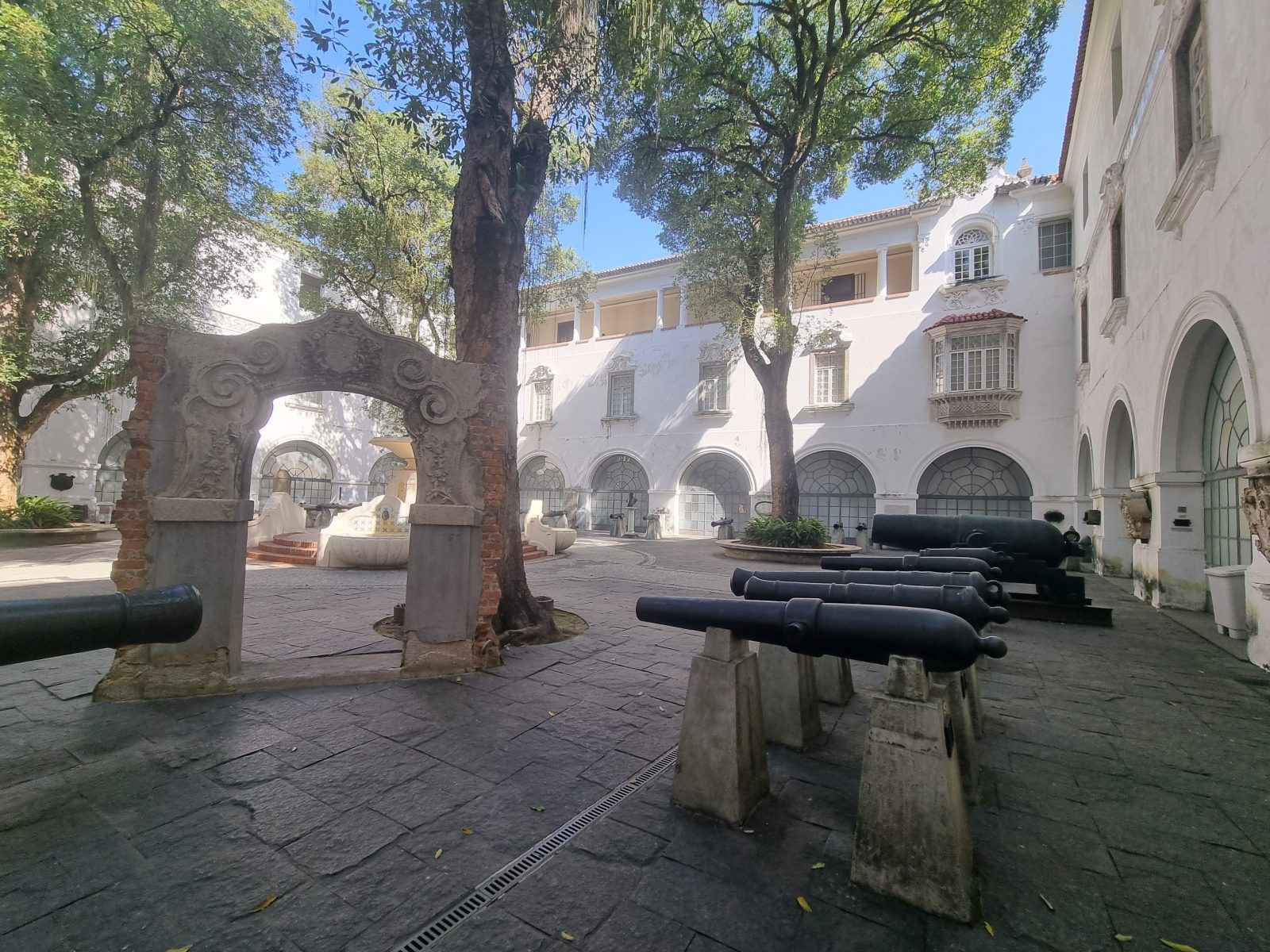 La première salle du musée se trouve être sa cour intérieure. Nous y découvrons une grande quantité de canons qui représentent tous les conflits que le Brésil a connu avec d’autres pays. Le premier canon vers lequel notre guide nous dirige s’avère être français. Il est marqué par le visage en relief de Louis XIV. Les éclats de cette guerre marquent encore Rio : une église non loin du musée a perdu un de ses deux clochers suite à un coup de canon tiré par les français. Celui-ci n’a jamais été remplacé depuis. Nous apprenons également que la cour du musée était à l’époque une place commerciale très importante.