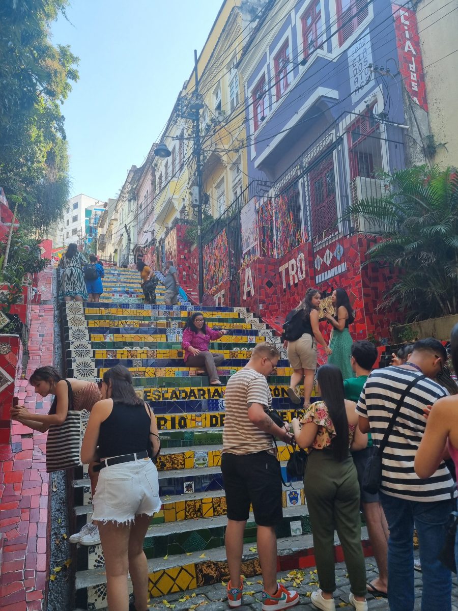 Nous sommes également passé·e·s devant les escaliers les plus connu du monde, qui se trouvent dans le quartier de Lapa. Ils ont été construits par Jorge Selaron en 1994 à l’occasion de la coupe du monde de football. Ce dernier ne les a cependant pas construits seul, mais avec l’aide de nombreux cariocas qui participaient en amenant des carreaux de céramique. L’artiste a été tragiquement retrouvé mort en 2013 de causes mystérieuses sur ses propres marches.