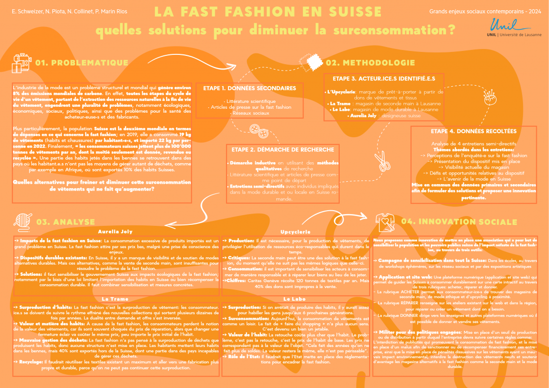 Catégories Posters La fast fashion en Suisse : quelles solutions pour diminuer la surconsommation ? Auteur de l’article Par Eléonore Petit Date de l’article 22 octobre 2024 Étiquettes Consommation, Fashion, GESC ← Cours immersifs pour migrants → Fast fashion et surconsommation : sensibiliser pour agir