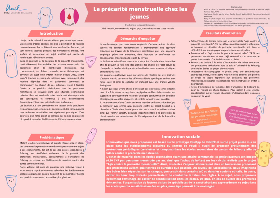Catégories Posters La précarité menstruelle chez les jeunes Auteur de l’article Par Cléolia Sabot Date de l’article 17 août 2023 Étiquettes Femmes*, GESC, Menstruations, Précarité, Santé ← Améliorer la santé publique grâce à l’application Yuka ? → Transition de l’école à la vie active ; Une difficulté d’accès aux ressources
