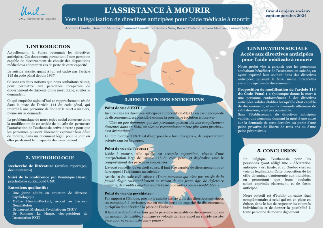 Catégories Posters L’assistance à mourir : Vers la légalisation de directives anticipées pour l’aide médicale à mourir Auteur de l’article Par Eléonore Petit Date de l’article 22 octobre 2024 Étiquettes Aide, Décès, GESC, Santé ← Don’t Rip’it Apart : cohésion sociale et réaménagement → Harcèlement scolaire : application mobile