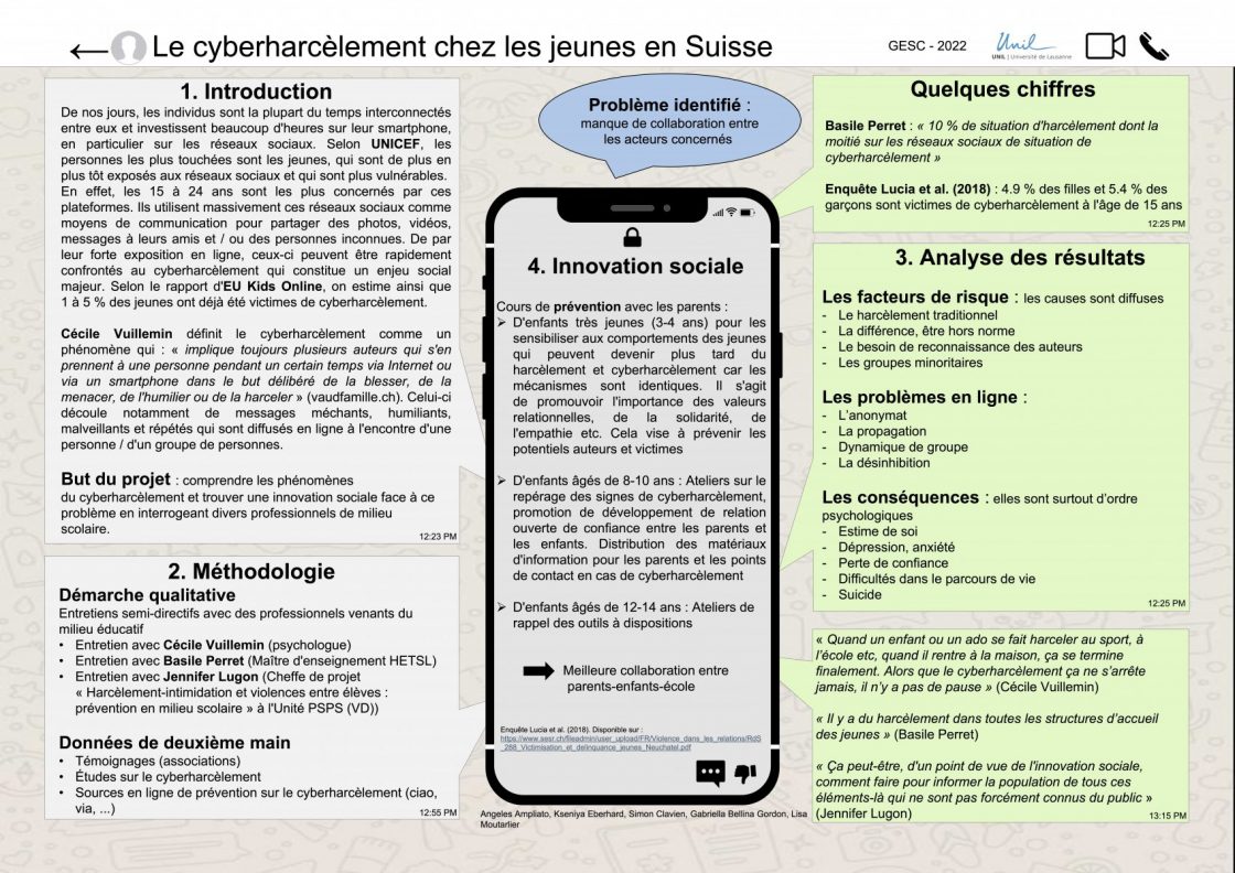Catégories Posters Le cyberharcèlement chez les jeunes en Suisse Auteur de l’article Par Cléolia Sabot Date de l’article 15 juillet 2022 Étiquettes Cyberharcèlement, GESC, Internet, Jeunes, Suisse ← Impact des réseaux sociaux sur l’image corporelle des jeunes → Le coût de la viande. Production et consommation extrême de la viande.