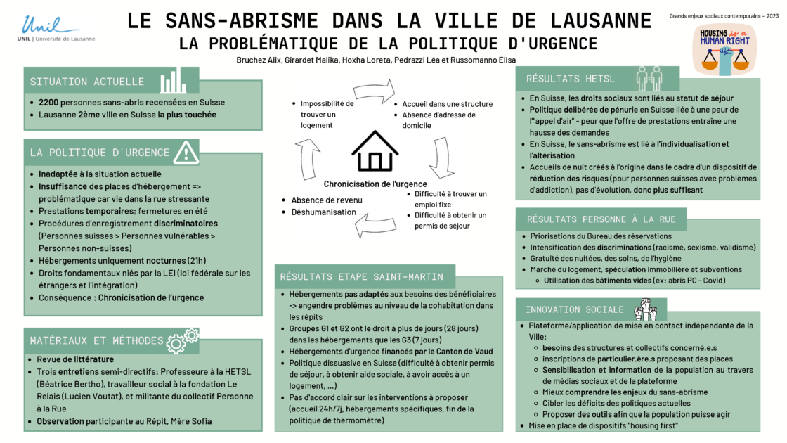 Catégories Posters Le sans-abrisme dans la ville de Lausanne ; la problématique de la politique d’urgence Auteur de l’article Par Eléonore Petit Date de l’article 5 septembre 2023 Étiquettes GESC, Lausanne, Politique, Sans-abrisme ← Mieux trier pour mieux valoriser ; le cercle vertueux de la valorisation des déchets organiques → Intégration des immigré·e·s dans le marché du travail