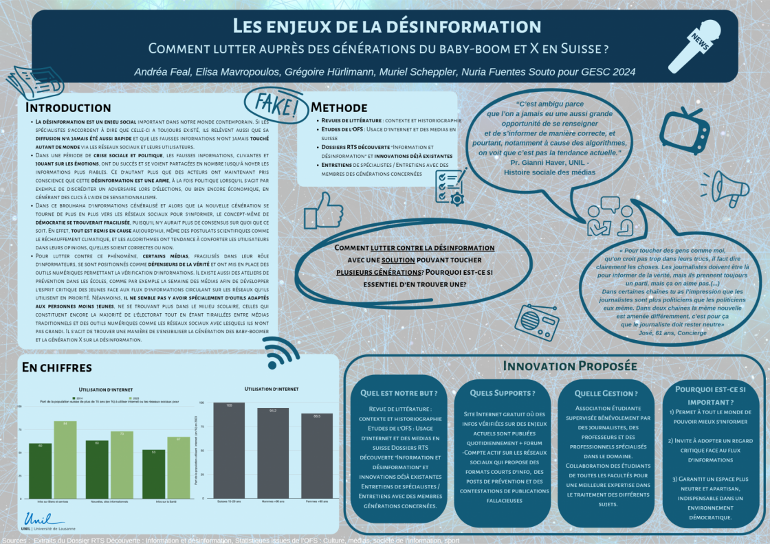 Catégories Posters Les enjeux de la désinformation: Comment lutter auprès des générations du baby-boom et X en Suisse ? Auteur de l’article Par Eléonore Petit Date de l’article 22 octobre 2024 Étiquettes Communication, désinformation, enjeux sociaux, GESC ← La crise du logement: Le sans-abrisme dans la ville de Lausanne → Favoriser la consommation locale et de saison auprès des étudiant⸱es universitaires