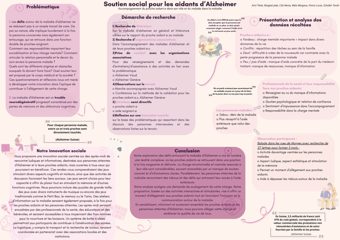 Catégories Posters Soutien social pour les aidants d’Alzheimer: Accompagnement du proche aidant⸱e dans son rôle et du malade dans la maladie Auteur de l’article Par Eléonore Petit Date de l’article 22 octobre 2024 Étiquettes Accompagnement, GESC, Maladie, Santé, Soutien ← Comment prémunir un centre social et culturel suisse romand contre le gaspillage alimentaire ? L’exemple de la Maison Picson à Blonay-Saint-Légier → Insertion des enfants réfugiés dans les écoles