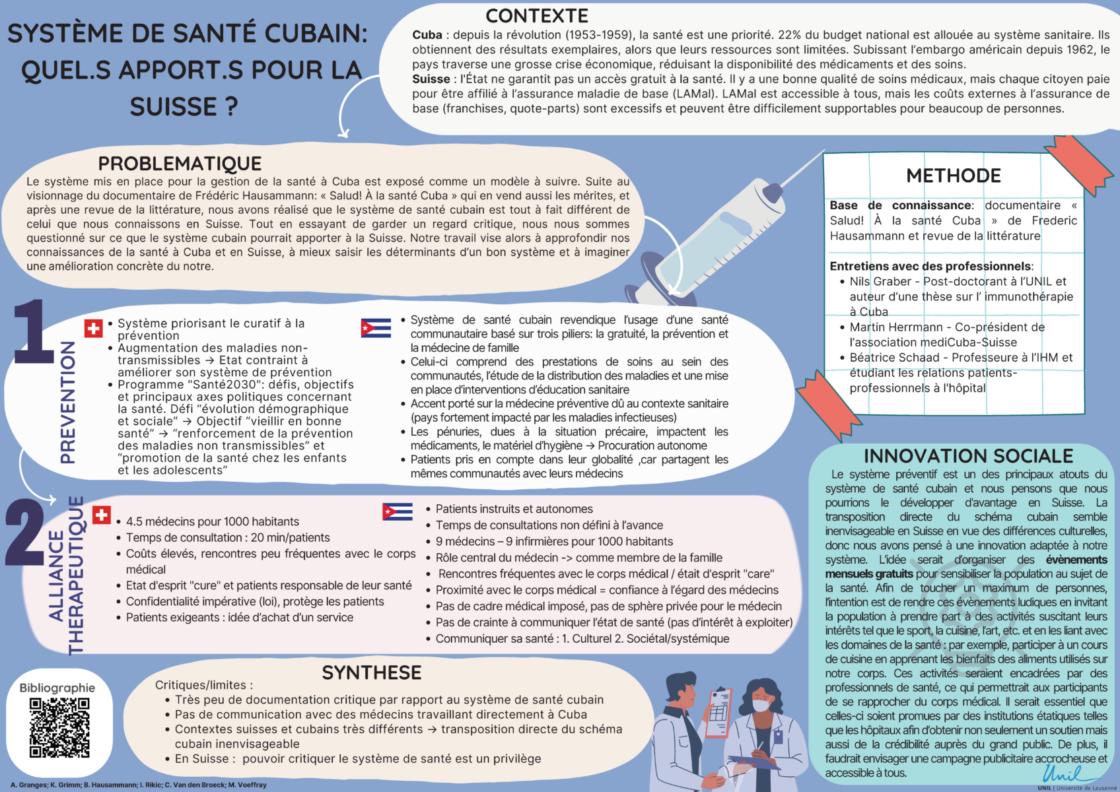 Catégories Posters Système de santé cubain : Quel·s apport·s pour la Suisse Auteur de l’article Par Eléonore Petit Date de l’article 5 septembre 2023 Étiquettes Cuba, GESC, Santé, Sécurité, Suisse, Système de santé ← La santé mentale et les universitaires → Précarité étudiante et accès à une alimentation saine et durable