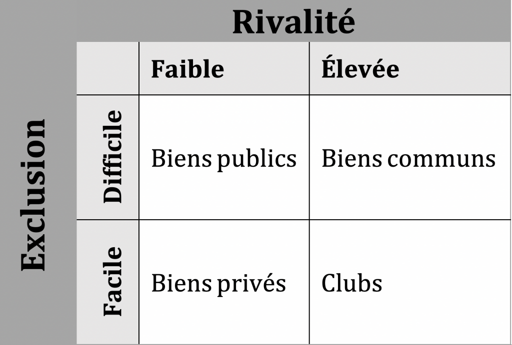 Ostrom E. et Ostrom V. (1977) présentent un schéma classique des différents types de biens économiques, qui mesure l’exclusion et la rivalité d’un bien :