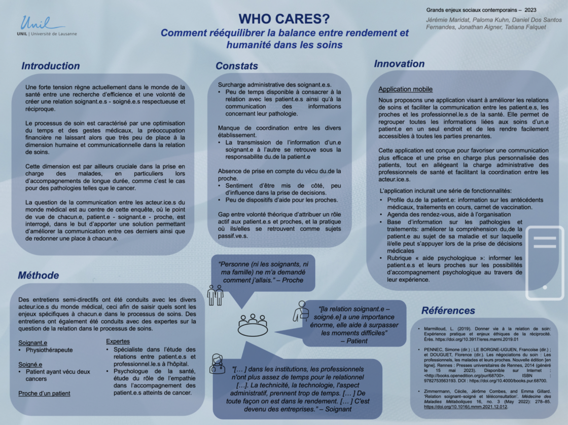 Catégories Posters Who cares ? Comment rééquilibrer la balance entre rendement et humanité dans les soins Auteur de l’article Par Eléonore Petit Date de l’article 5 septembre 2023 Étiquettes Equilibre, GESC, Rendement, Santé, Soins ← Multitasking sous pression : stress lié à l’impact des caisses automatiques → Ralentir la fast fashion : des solutions visant la durabilité des textiles