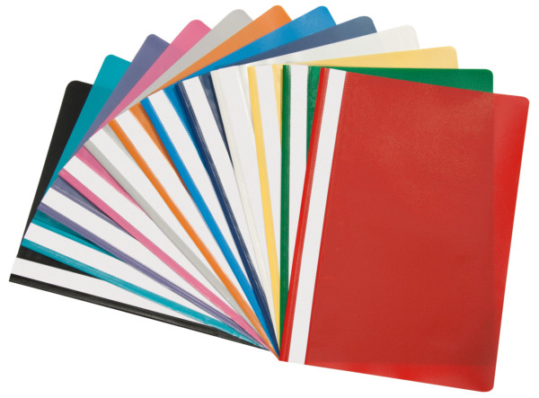 en PP, couverture transparente, bande d’inscription sur toute la hauteur, avec 2 languettes pour perforation 80 mm,