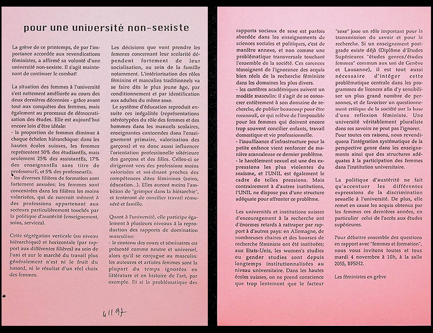 STUDER Brigitte, « Grève des femmes (1991) », in: Dictionnaire historique de la Suisse (DHS), version du 12.06.2019, traduit de l’allemand. Online: https://hls-dhs-dss.ch/fr/articles/058286/2019-06-12/, consulté le 21.01.2026.