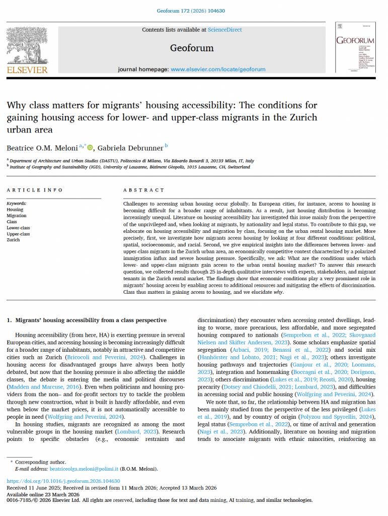 Together with Beatrice Olga Meloni, from Politecnico di Milano, Gabriela Debrunner has published a latest article on « migrants’ housing accessibility from a class perspective » in Geoforum. The paper examines migrants’ access to housing through the intersectional lens of class, moving beyond a vulnerability-centered understanding of migrant tenants’ position in the housing market, and unveiling inequalities between, among, and within migrant groups.