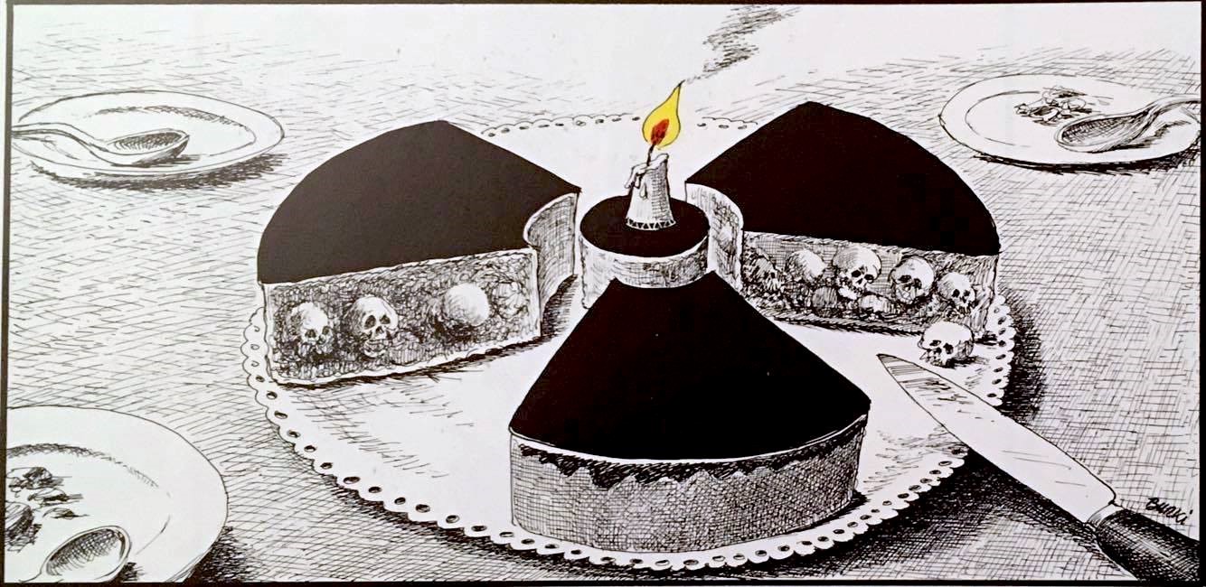 À l’occasion de premier anniversaire de la catastrophe de Tchernobyl, Burki dessine un gâteau dont la forme fait référence au « trisecteur », symbole de la radioactivité. Ce mortifère gâteau d’anniversaire évoque également l’adage « prendre sa part du gâteau » autrement dit, prendre sa part des gains. Cet aspect est appuyé par les trois assiettes qui entourent le gâteau, deux presque vides et la troisième propre, comme si quelqu’un avait refusé de prendre sa part. La présence des têtes de mort dans la tranche du gâteau rappelle les nombreux décès provoqués par la catastrophe. La bougie marquant l’anniversaire de l’accident prend ici la forme d’une cheminée de refroidissement de centrale nucléaire, enflammée par la mèche, seul élément coloré du dessin. Avec cette œuvre Burki arrive à synthétiser un grand nombre d’idées, et ce sans utiliser un seul mot : une image muette et pourtant parlante et riche de sens.