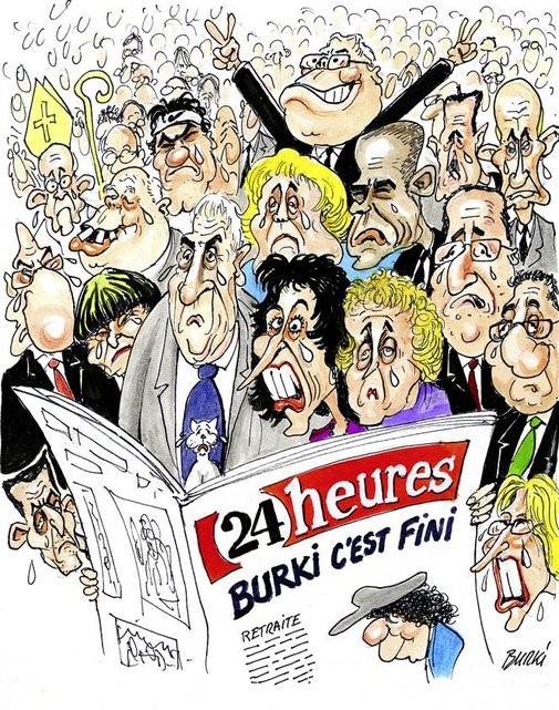 Au fil du temps, Burki se spécialise également dans les dessins de personnalités, caricaturant volontiers les figures du pouvoir en Suisse. Ces « charges », souvent très appréciées par les « victimes » du dessinateur, deviendront, vers la fin de sa carrière, sa marque de fabrique. Tel est le sujet du dernier dessin qu’il réalise pour 24 heures, où les principaux caricaturés pleurent son départ du journal, à l’exception de Christoph Blocher, qui semble s’en réjouir. Une fois à la retraite Burki a continué à dessiner, choisissant souvent des sujets plus internationaux que ceux qu’il avait l’habitude de traiter pour le journal régional 24 heures et les diffusant sur sa page Facebook. Au lendemain de son décès, survenu peu avant celui d’un autre dessinateur de presse de renom, Mix & Remix (Philippe Becquelin) (https://www.1erdegre.ch/blog/), Raymond Burki sera salué à l’instar de ce dernier comme l’un des dessinateurs de presse majeur de son temps en Suisse romande.